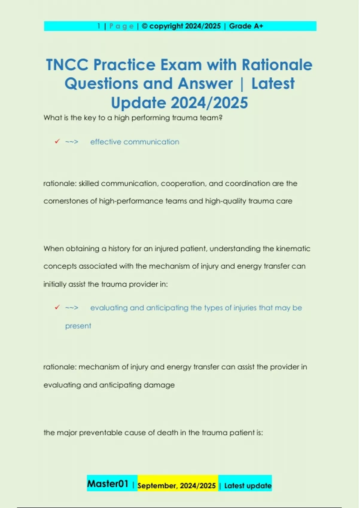 What is the key to a high performing trauma team? ~~> effective communication rationale: skilled communication, cooperation, and coordination are the cornerstones of high-performance teams and high-quality trauma care When obtaining a history for an injured patient, understanding the kinematic concepts associated with the mechanism of injury and energy transfer can initially assist the trauma provider in: ~~> evaluating and anticipating the types of injuries that may be present rationale: mechanism of injury and energy transfer can assist the provider in evaluating and anticipating damage the major preventable cause of death in the trauma patient is: 2 | P a g e | © copyright 2024/2025 | Grade A+ Master01 | September, 2024/2025 | Latest update ~~> uncontrolled hemorrhage rationale: uncontrolled hemorrhage is the major cause of preventable death after injury, so assessment to identify uncontrolled hemorrhage is key to the initial assessment process the across-the-room observation step in the initial assessment provides the opportunity to ~~> reprioritize circulation before airway or breathing rationale: the across-the-room observation is done at the beginning of the primary survey to rapidly assess the need to reprioritize circulation before airway or breathing. This is done if uncontrolled external hemorrhage is identified. Which of the following accurately describes ventilation prinicples associated with a bag-mask device? ~~> ventilate at a rate of 10-12 breaths/minute rationale: if ventilation is ineffective, assist ventilation at 10-12 breaths/minute or one every 5-6 seconds 3 | P a g e | © copyright 2024/2025 | Grade A+ Master01 | September, 2024/2025 | Latest update Which of the following is the best measure of the adequacy of cellular perfusion and helps to predict the outcome of resuscitation? ~~> base deficit rationale: base deficit serves as an endpoint measurement of the adequacy of cellular perfusion and when used in conjunction with serum lactate helps predict the success of resuciation What is the safe pharmacological alternative to opioids for rib fracture pain management in the anticoagulated patient? ~~> intercostal nerve blocks rationale: continuous intercostal nerve blocks use long-acting anesthetics and can provide safe and effective pain management for the anticoagulated patient. In a patient with severe traumatic brain injury, hypocapnia causes: ~~> cerebral vasoconstrictio