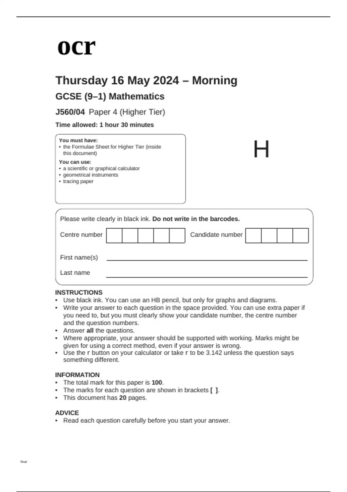 • the Formulae Sheet for Higher Tier (inside