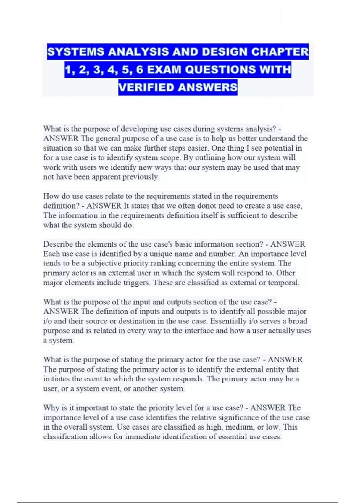 SYSTEMS ANALYSIS AND DESIGN CHAPTER 1, 2, 3, 4, 5, 6 EXAM QUESTIONS WITH VERIFIED ANSWERS...