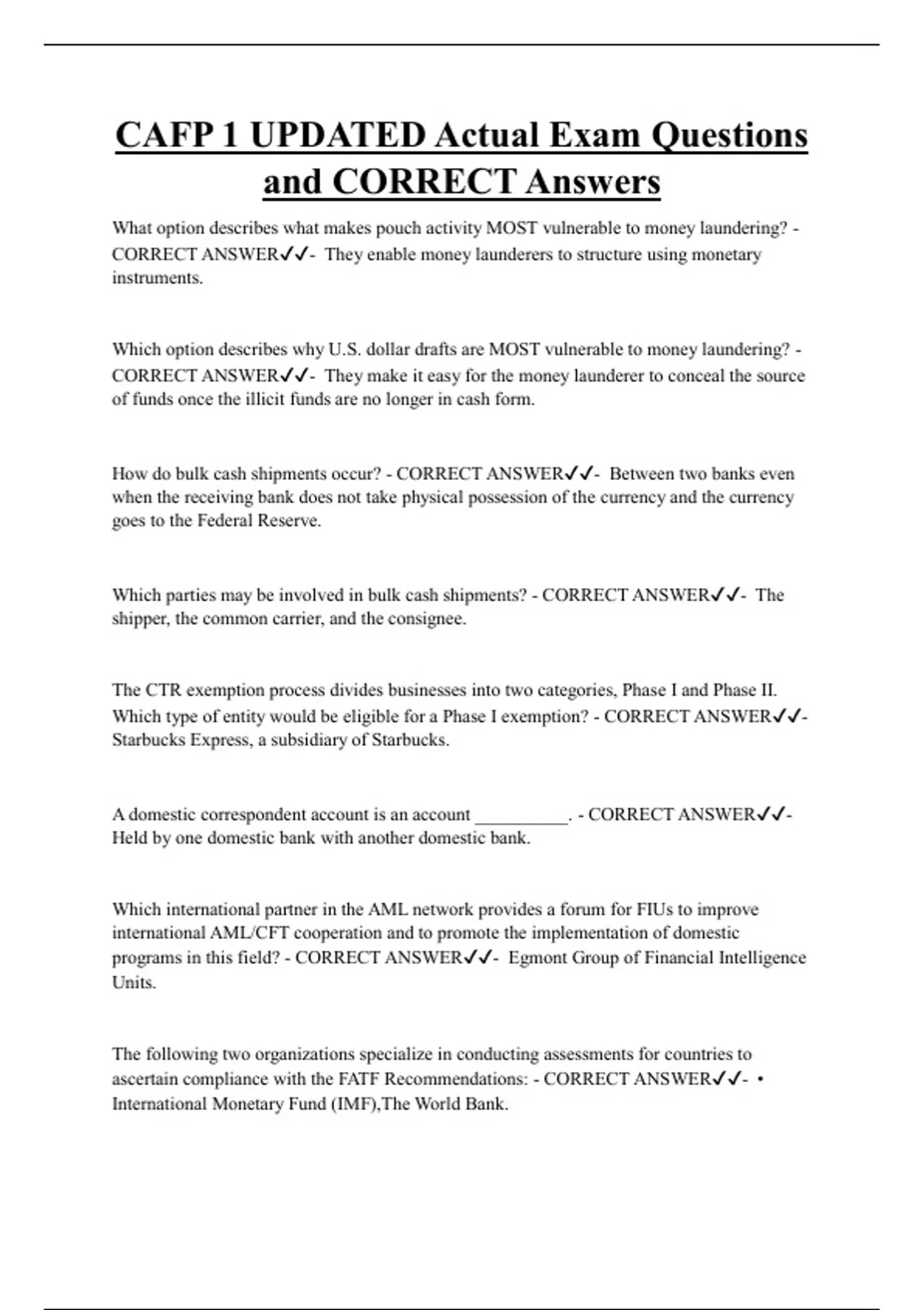 CAFP 1 UPDATED Actual Exam Questions and CORRECT Answers What option describes what makes pouch activity MOST vulnerable to money laundering? - CORRECT ANSWER- They enable money launderers to structure using monetary instruments. Which option describes why U.S. dollar drafts are MOST vulnerable to money laundering? - CORRECT ANSWER- They make it easy for the money launderer to conceal the source of funds once the illicit funds are no longer in cash form