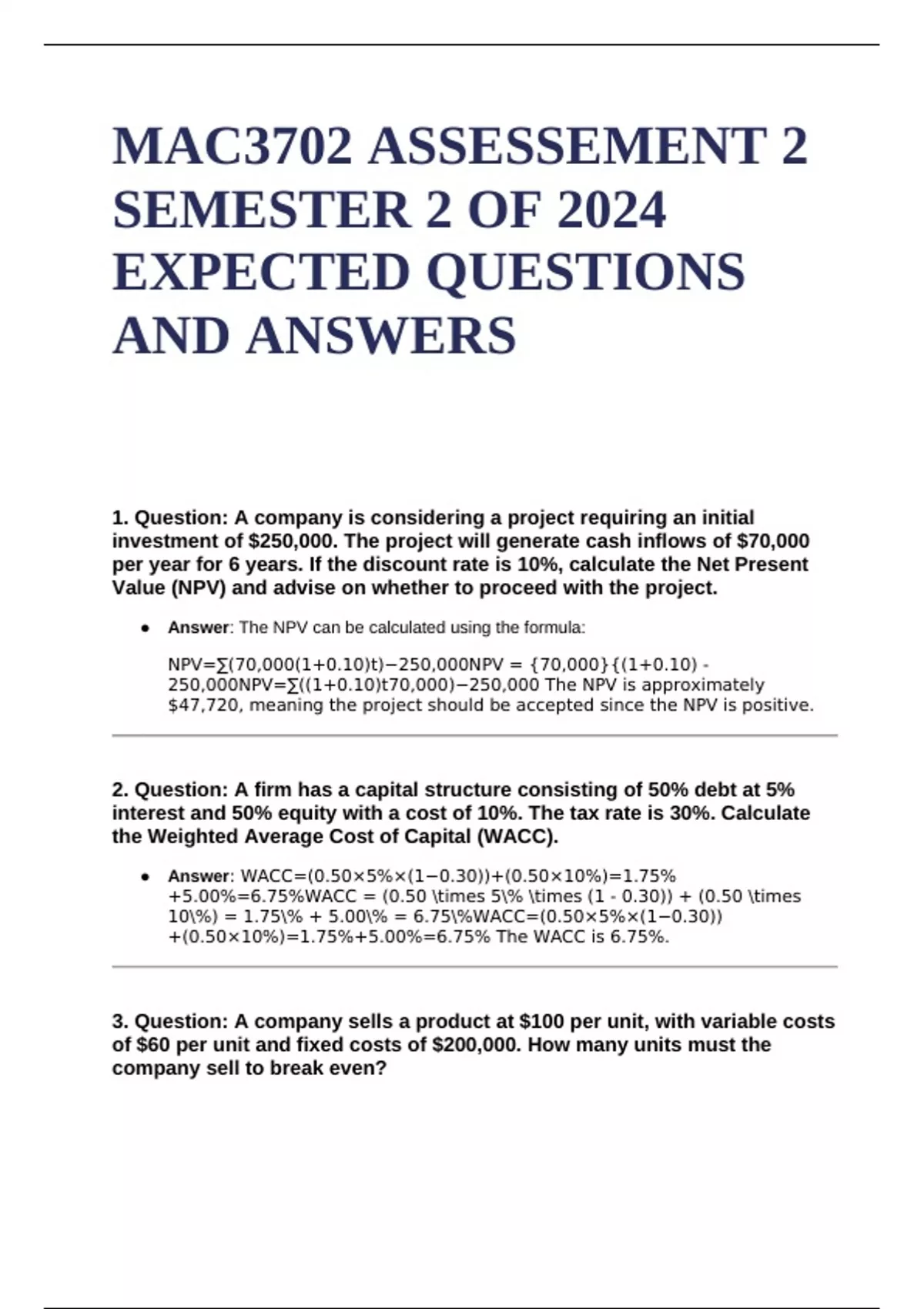 ● Answer: WACC=(0.50×5%×(1−0.30))+(0.50×10%)=1.75%