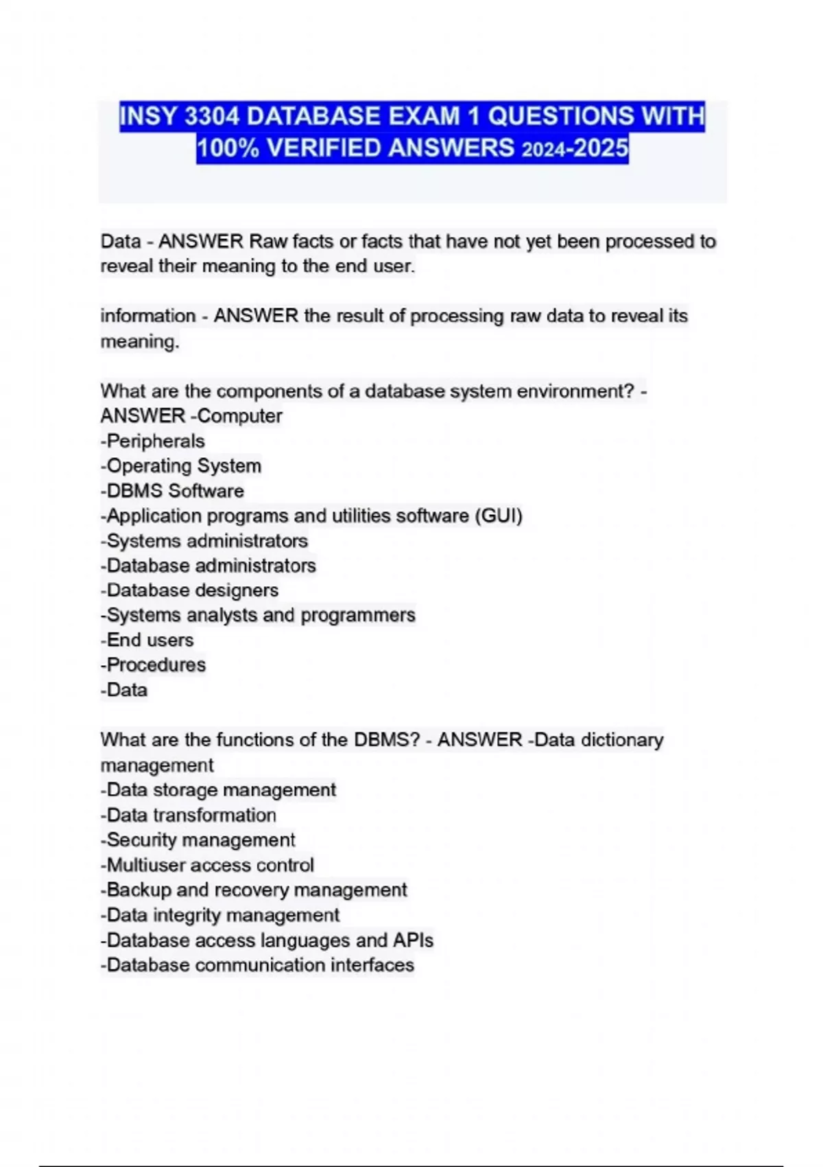 INSY 3304 DATABASE EXAM 1 QUESTIONS WITH 100 VERIFIED ANSWERS ...