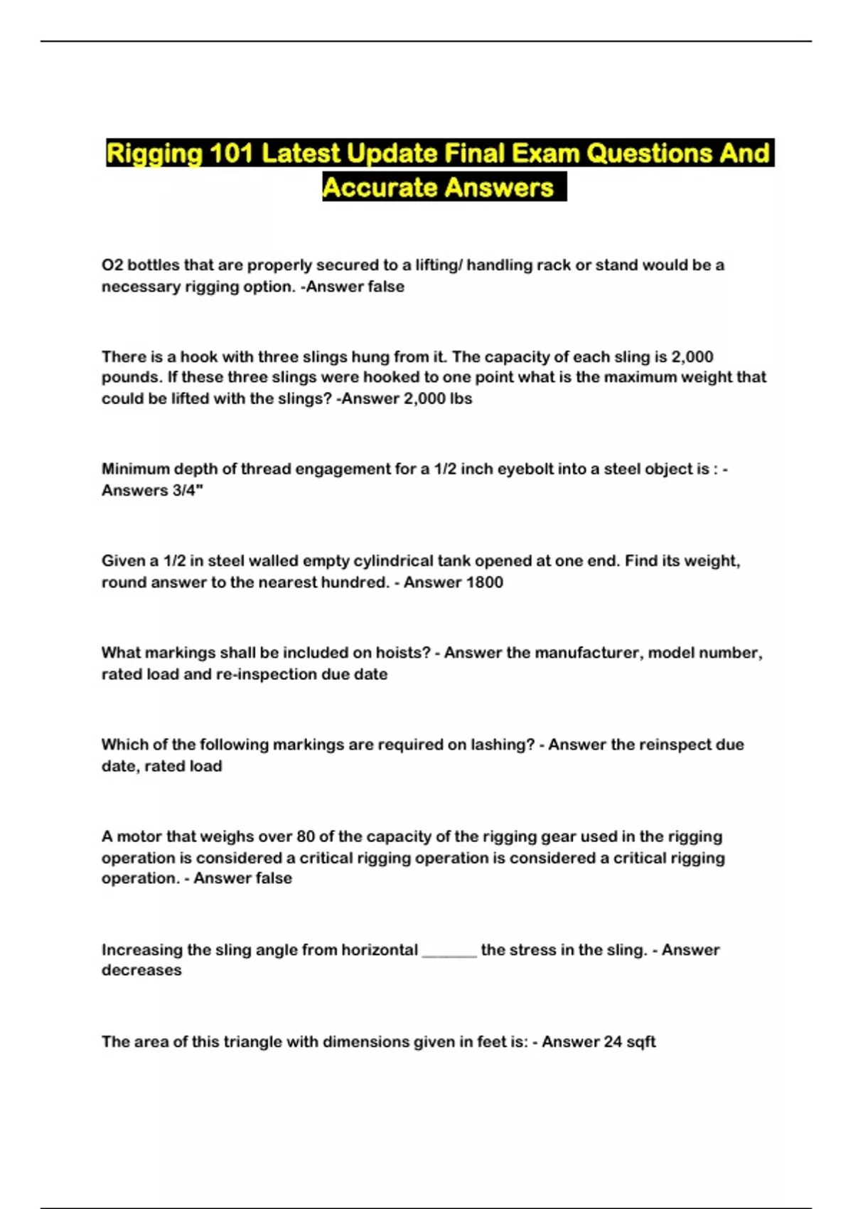 Rigging 101 Latest Update Final Exam Questions And Accurate Answers