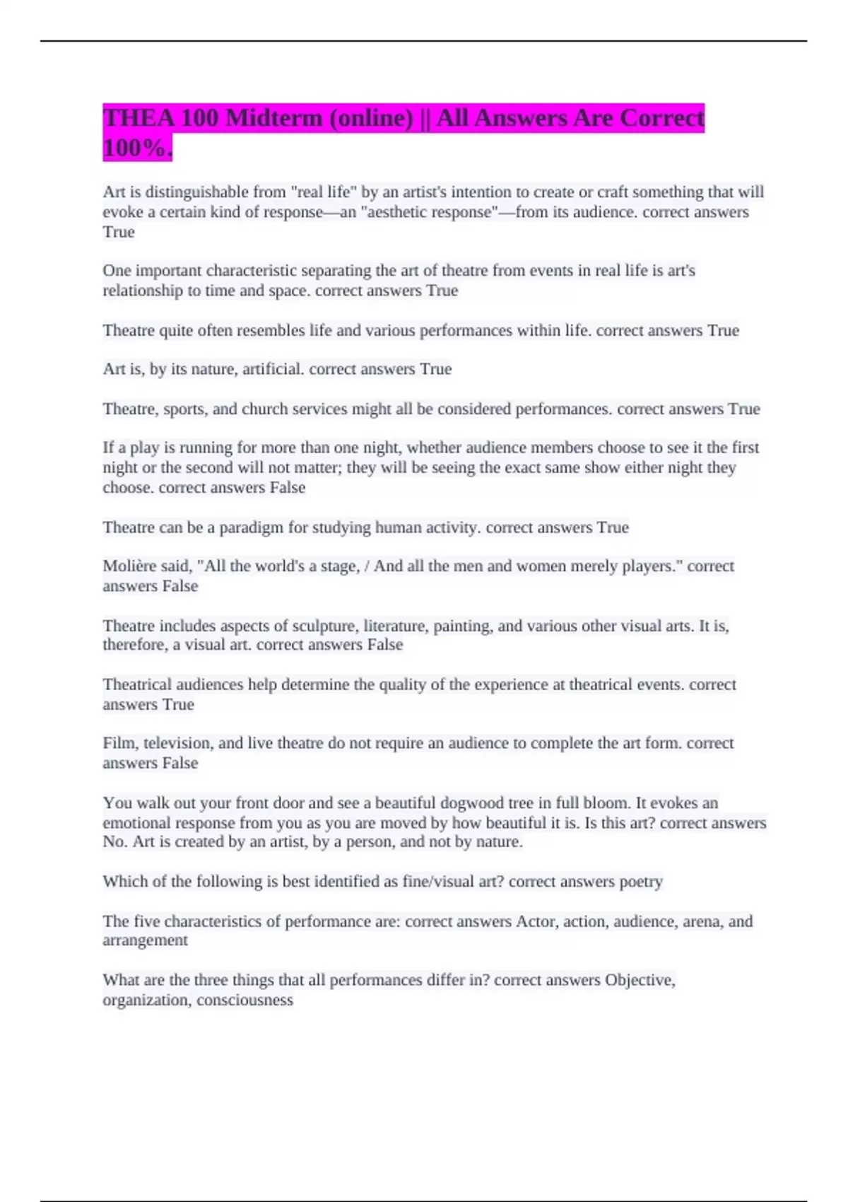 THEA 100 Midterm (online) || All Answers Are Correct 100%.