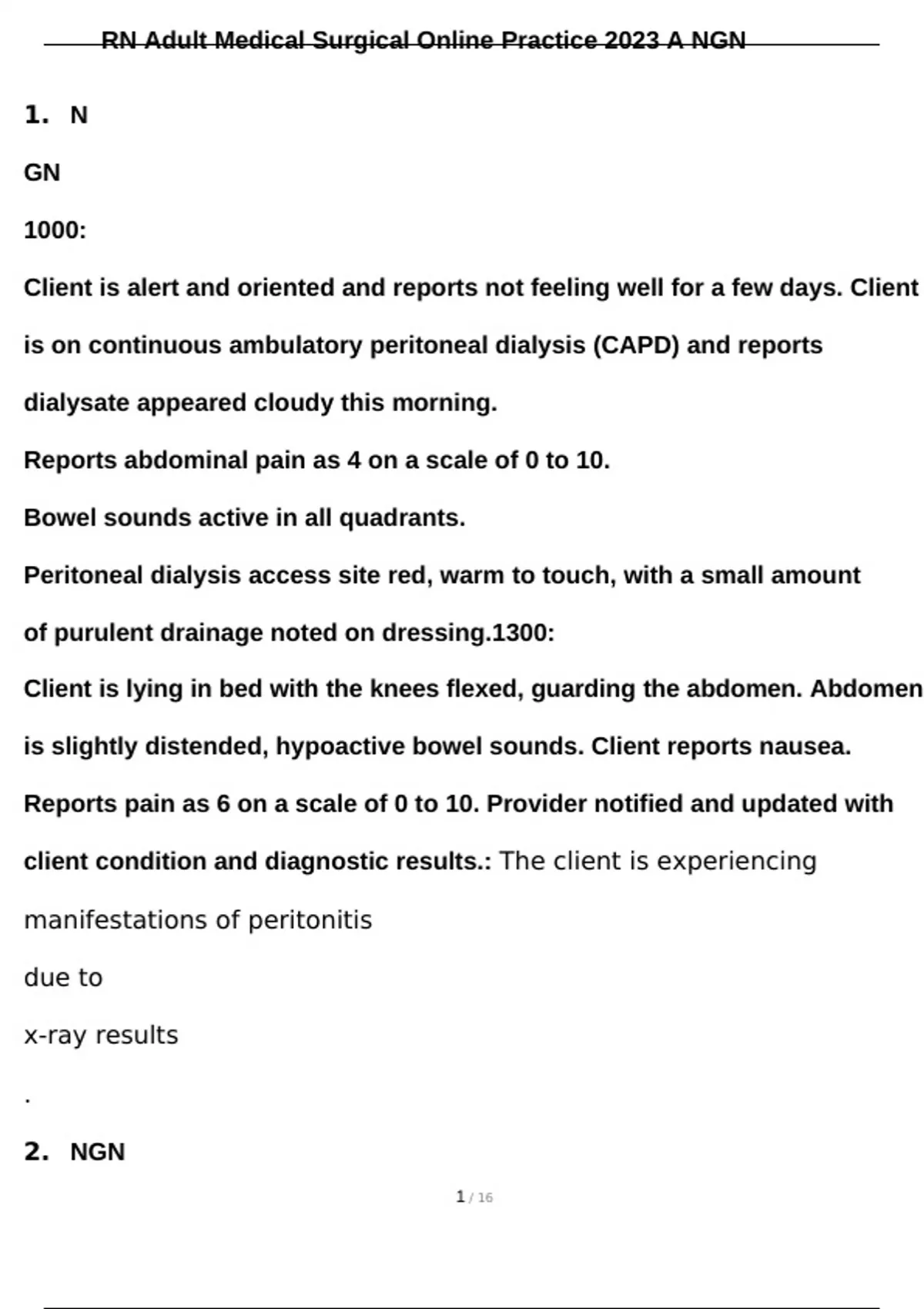 1. NGN 1000: Client is alert and oriented and reports not feeling well for a few days. Client is on continuous ambulatory peritoneal dialysis (CAPD) and reports dialysate appeared cloudy this morning. Reports abdominal pain as 4 on a scale of 0 to 10. Bowel sounds active in all quadrants. Peritoneal dialysis access site red, warm to touch, with a small amount of purulent drainage noted on dressing.1300: Client is lying in bed with the knees flexed, guarding the abdomen. Abdomen is slightly distended, hypoactive bowel sounds. Client reports nausea. Reports pain as 6 on a scale of 0 to 10. Provider notified and updated with client condition and diagnostic results.: The client is experiencing manifestations of peritonitis due to x-ray results