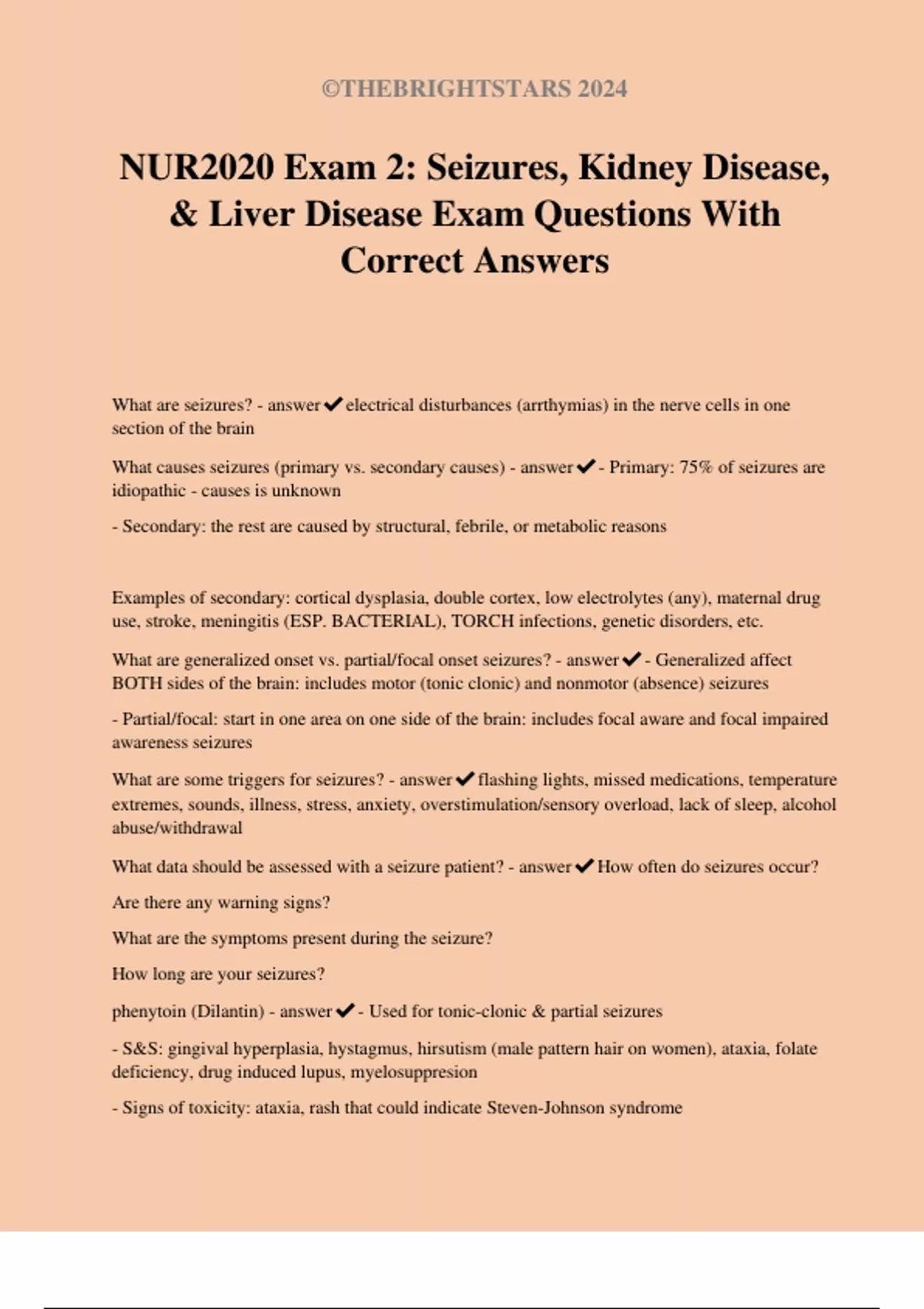 NUR2020 Exam 2: Seizures, Kidney Disease, & Liver Disease Exam Questions With Correct Answers What are seizures? - answerelectrical disturbances (arrthymias) in the nerve cells in one section of the brain What causes seizures (primary vs. secondary causes) - answer- Primary: 75% of seizures are idiopathic - causes is unknown - Secondary: the rest are caused by structural, febrile, or metabolic reasons Examples of secondary: cortical dysplasia, double cortex, low electrolytes (any), maternal drug use, stroke, meningitis (ESP. BACTERIAL), TORCH infections, genetic disorders, etc. What are generalized onset vs. partial/focal onset seizures? - answer- Generalized affect BOTH sides of the brain: includes motor (tonic clonic) and nonmotor (absence) seizures - Partial/focal: start in one area on one side of the brain: includes focal aware and focal impaired awareness seizures What are some triggers for seizures? - answerflashing lights, missed medications, temperature extremes, sounds, illness, stress, anxiety, overstimulation/sensory overload, lack of sleep, alcohol abuse/withdrawal What data should be assessed with a seizure patient? - answerHow often do seizures occur? Are there any warning signs? What are the symptoms present during the seizure? How long are your seizures? phenytoin (Dilantin) - answer- Used for tonic-clonic & partial seizures - S&S: gingival hyperplasia, hystagmus, hirsutism (male pattern hair on women), ataxia, folate deficiency, drug induced lupus, myelosuppresion - Signs of toxicity: ataxia, rash that could indicate Steven-Johnson syndrome ©THEBRIGHTSTARS 2024 - Nursing considerations: do not give with milk or antacids, monitor serum levels closely (should be 10-20 mcg); will prolong the half-life of warfarin & coumadin (PT/INR will get longer - patient more likely to bleed b/c even slower clotting); may worsen MG symptoms; will deactivate oral contraceptives- use alternative birth control methods carbamezepine (Tegretol) - answer- Used for secondary tonic-clonic & partial seizures - S&S: ataxia, diplopia, hepatitis, aplastic anemia, behavior changes - Nursing considerations: monitor for visual changes, monitor liver function (AST/ALT), monitor CBC, do not crush or chew All the drugs ending in -pam (Lorazepam, Diazepam, Clonazepam) - answer- anti-seizure meds (anxiolytics, benzos) - S&S: sedation, amnesia, hallucinations, insomnia, visual disturbances, respiratory depression, lack of appetite or appetite changes - Nursing considerations: ANTIDOTE: Flumazenil, monitor renal & liver function and labs if using long-term, do not discontinue rapidly, can exacerbate MG symptoms, patients can develop tolerance if used often and it will not be as successful What diet can help with epilepsy? - answerKeto (high fat, low carb) - still need to use medications Vagus nerve stimulator therapy (VNS) - answerSends electrical impulses to the vagus nerve which carries pulses to the brain (runs up the side of the neck) - This helps prevent or shorten length of seizures What are seizure precautions? - answerOxygen Suction equipment Bed close to ground IV access ready Side rails up and padded w/one pillow or pad each Teaching plan fro patient & family w/epilepsy - answer- It's not contagious, not a mental illness, or cognitive disability - Can start at any point in life - Adhere to your medication re