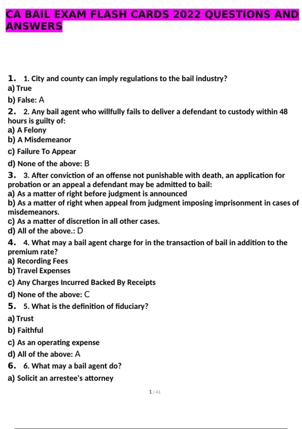 CA BAIL EXAM FLASH CARDS 2022 QUESTIONS AND ANSWERS 1. 1. City and county can imply regulations to the bail industry? a) True b) False: A 2. 2. Any bail agent who willfully fails to deliver a defendant to custody within 48 hours is guilty of: a) A Felony b) A Misdemeanor c) Failure To Appear d) None of the above: B 3. 3. After conviction of an offense not punishable with death, an application for probation or an appeal a defendant may be admitted to bail: a) As a matter of right before judgment is announced b) As a matter of right when appeal from judgment imposing imprisonment in cases of misdemeanors. c) As a matter of discretion in all other cases. d) All of the above.: D