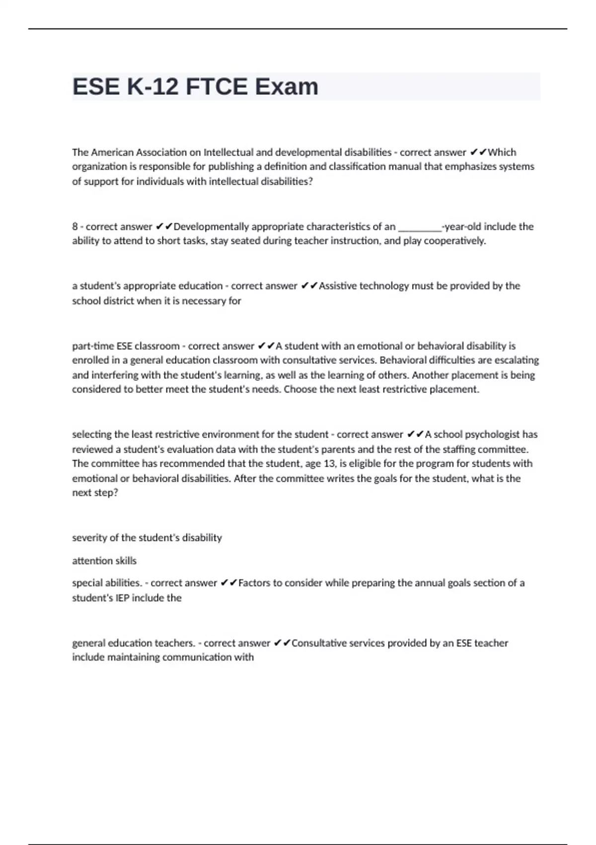 ESE K-12 FTCE Exam questions n answers graded A+
