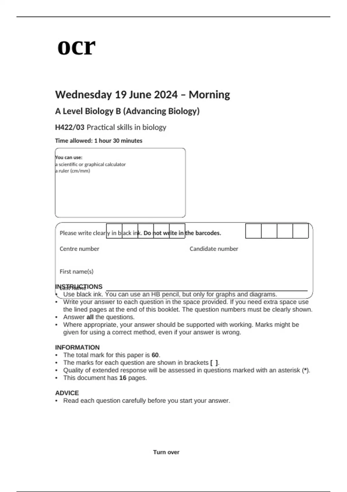 ocr A Level Biology B (H422-03) Question Paper June2024.