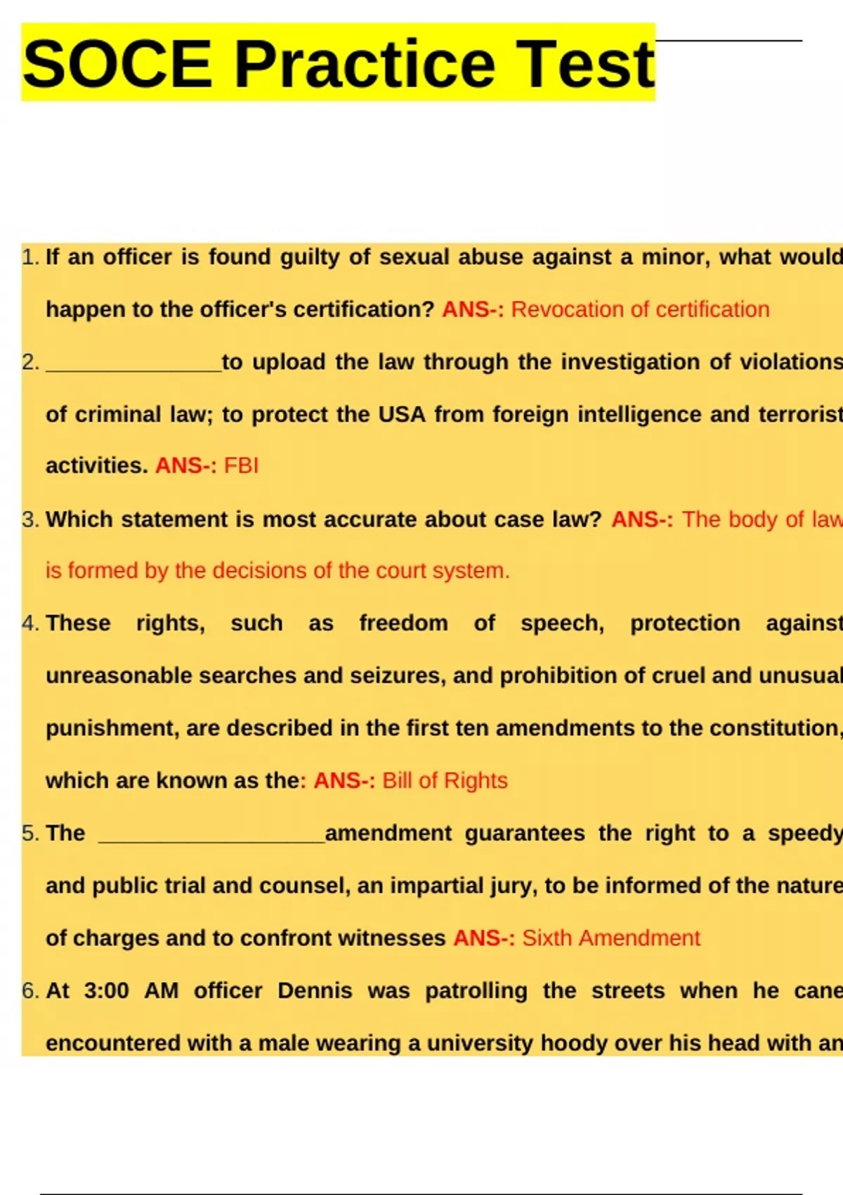 SOCE Practice Test Exam Questions And Answers 100% Verified If an officer is found guilty of sexual abuse against a minor, what would happen to the officer's certification? - answerRevocation of certification ______________to upload the law through the investigation of violations of criminal law; to protect the USA from foreign intelligence and terrorist activities. - answerFBI Which statement is most accurate about case law? - answerThe body of law is formed by the decisions of the court system. These rights, such as freedom of speech, protection against unreasonable searches and seizures, and prohibition of cruel and unusual punishment, are described in the first ten amendments to the constitution, which are known as the: - answerBill of Rights The __________________amendment guarantees the right to a speedy and public trial and counsel, an impartial jury, to be informed of the nature of charges and to confront witnesses - answerSixth Amendment At 3:00 AM officer Dennis was patrolling the streets when he cane encountered with a male wearing a university hoody over his head with an object in his hands walking towards the dorms, when officer Dennis approached the male he began to walk faster and not look back, based on what legal concept can officer Dennis detain the male? - answerReasonable Suspicion The state must prove the following elements to convict a suspect of: 1. The offender entered and remained in a structure or conveyance owned by or in the possession of the victim. 2. The offender did not have the permission or consent of the victim, or anyone authorized to act for the victim to enter and/or remain in the structure or conveyance at the time. 3. At the time of entering and/or remaining in the structure or conveyance, the offender had a fully formed, conscious intent to commit the crime that is listed in the charge. - answerElements of Burglary The state must prove the following elements to convict a suspect of_________________? 1. The offender actually and intentionally touched or struck the victim against the victim's will. 2. The offender intentionally caused bodily harm to the victim. - answerElements of Battery The state must prove the following elements to convict a suspect of__________________? 1. The offender intentionally and unlawfully threatened, either by word or act, to do violence to the victim. 2. At the time, the offender appeared to have the ability to carry out the threat. 3. The act of the offender created in the mind of the victim a well-founded fear that the violence was about to take place. 4. The victim was at the time a law enforcement officer, firefighter, emergency medical care provider, law enforcement explorer, public transit employee of agent, or other specified officer. 5. The offender knew the victim was a law enforcement officer, firefighter, employee or agent, or other specified officer. 6. t the time of the assault, the victim was engaged in the lawful performance of his duties. - answerElements of Assault on Law Enforcement Officer of Firefighter Who does domestic violence pertain to? - answerFamily or household members A women picked up someone else's luggage at the airport that was identical to hers. She has no criminal intent to steal it, it was a mistake. What legal defense applies to the woman? - answerMistake of ignorance of fact Examples of drugs, a gun, clothing, or money would be considered what type of evidence? - answerPhysical evidence Law enforcement officers are also authorized to use reasonable and necessary force to effect an __________________? - answerInvestigative Stop Which statement does not apply to ethical decision making? - answerCan I get away with what I'm about to do? During a traffic stop, the officer has probable cause to believe that the driver is under the influence, therefore the officer is placing the suspect under arrest for DUI, the officer places the handcuffs on the suspect and tells the suspect to walk to the back of the car. Once the suspect began to walk the suspect fell and hurt himself since he could not break his fall. Under what tort can the suspect try to sue the officer? - answerNegligence On February 17, 2012 Alex and his friends planned to stage a burglary at Alex's house. Alex told his friends that he would take his parents out to dinner while they would burglarize his parents home and take their TV and expensive jewelry. Once the burglary would take place Alex and his friends promised to share the money. What is Alex's role in the staged crime? - answerPrincipal Of The First De