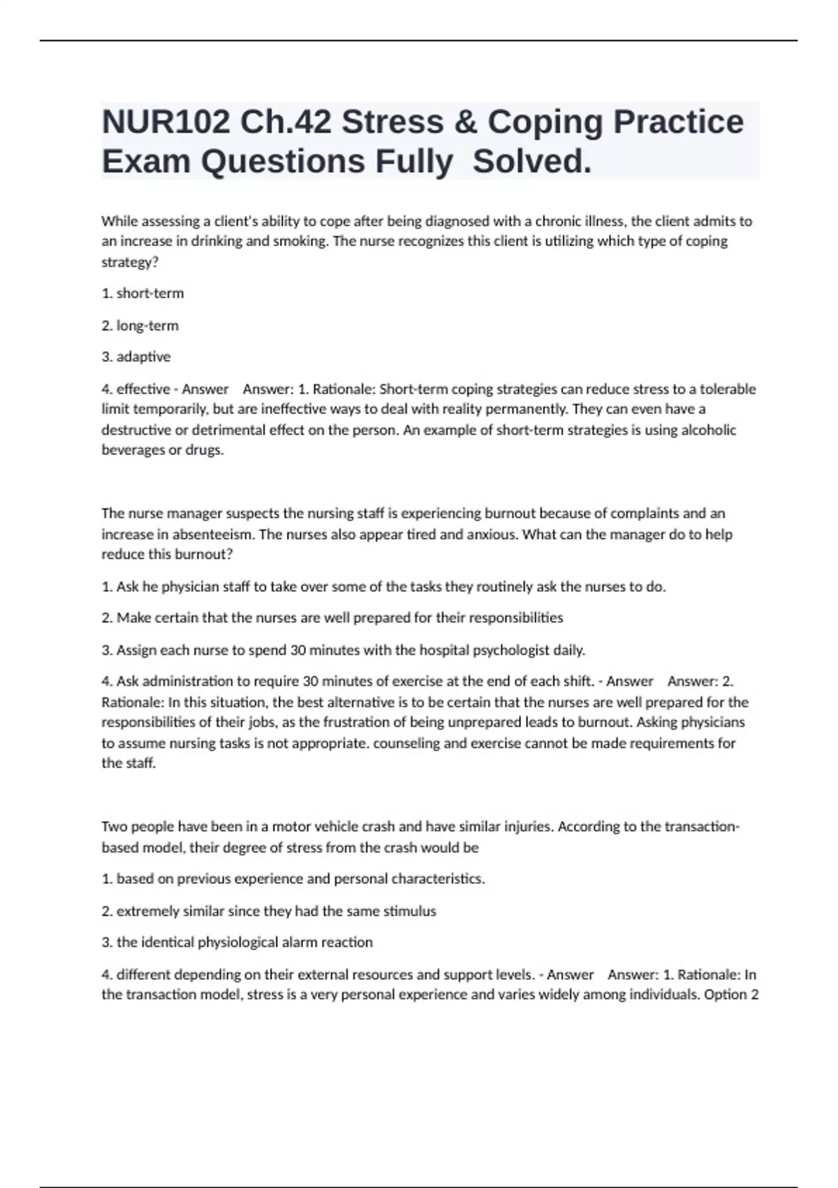 4. effective - Answer Answer: 1. Rationale: Short-term coping strategies can reduce stress to a tolerable