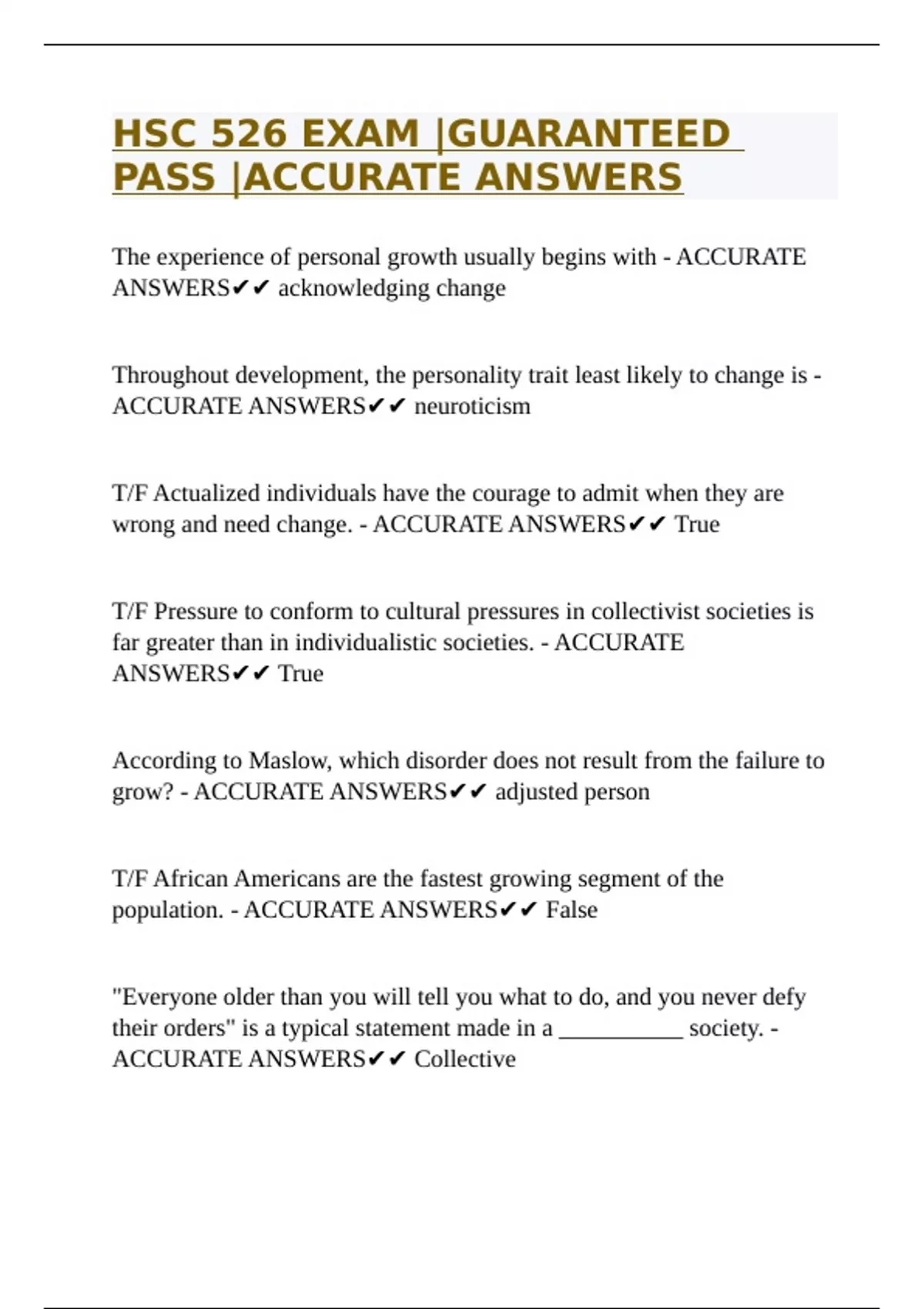 The experience of personal growth usually begins with - ACCURATE ANSWERS acknowledging change Throughout development, the personality trait least likely to change is - ACCURATE ANSWERS neuroticism T/F Actualized individuals have the courage to admit when they are wrong and need change. - ACCURATE ANSWERS True T/F Pressure to conform to cultural pressures in collectivist societies is far greater than in individualistic societies. - ACCURATE ANSWERS True According to Maslow, which disorder does not result from the failure to grow? - ACCURATE ANSWERS adjusted person T/F African Americans are the fastest growing segment of the population. - ACCURATE ANSWERS False "Everyone older than you will tell you what to do, and you never defy their orders" is a typical statement made in a __________ society. - ACCURATE ANSWERS Collective