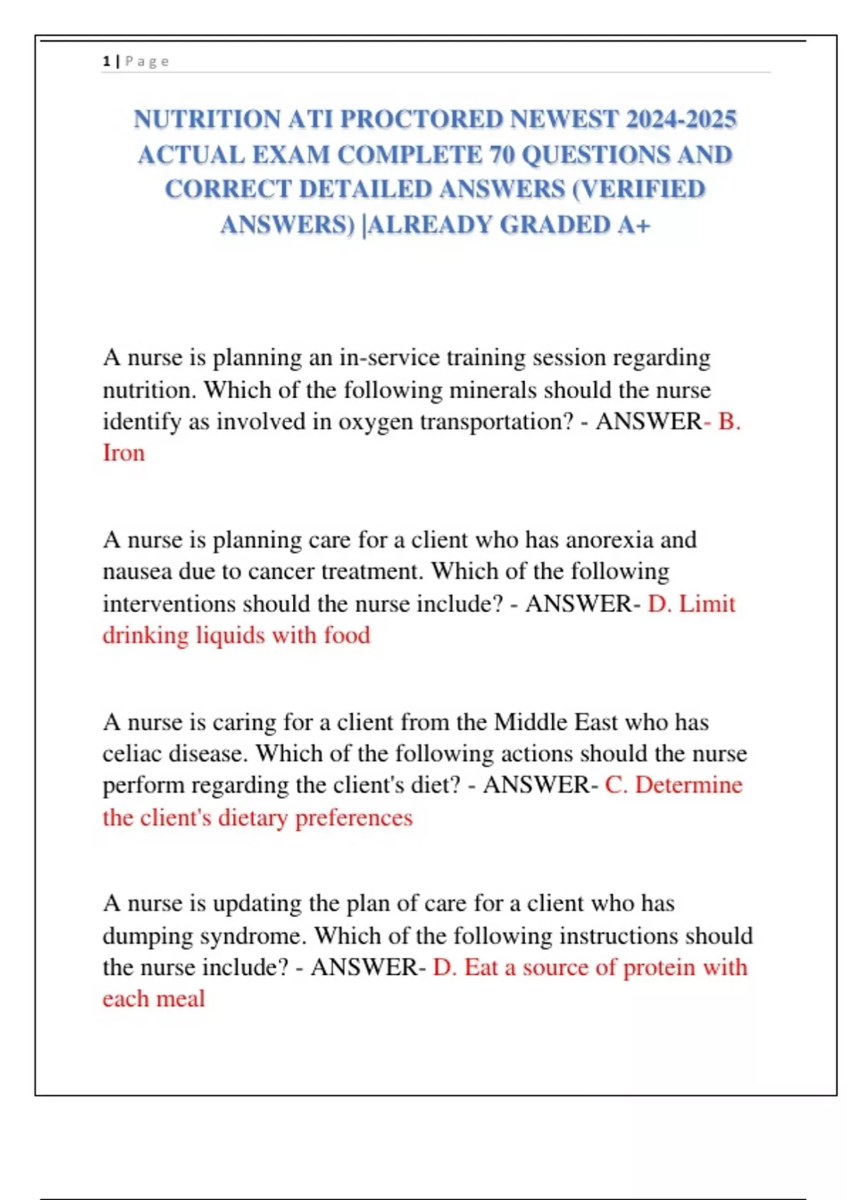 NUTRITION ATI PROCTORED NEWEST ACTUAL EXAM COMPLETE 70 QUESTIONS AND CORRECT DETAILED ANSWERS (VERIFIED ANSWERS) |ALREADY GRADED A+