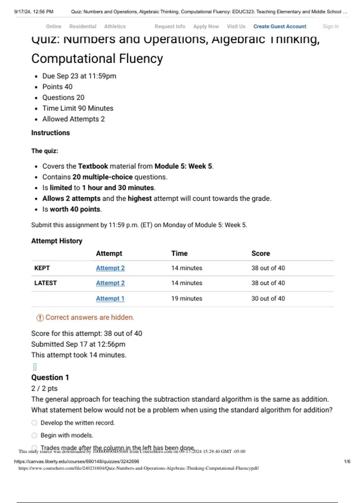, 9/17/24, 12:56 PM Quiz: Numbers and Operations, Algebraic Thinking, Computational Fluency: EDUC323: Teaching Elementary and Middle School …
