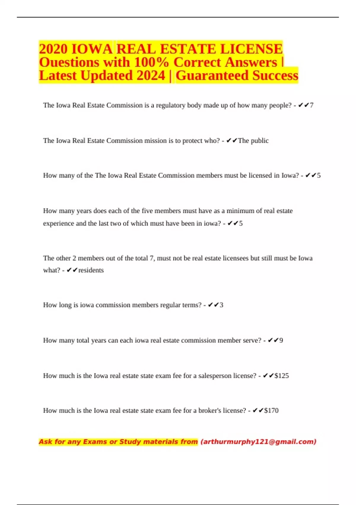 2020 IOWA REAL ESTATE LICENSE Questions with 100% Correct Answers | Latest Updated 2024 | Guaranteed Success