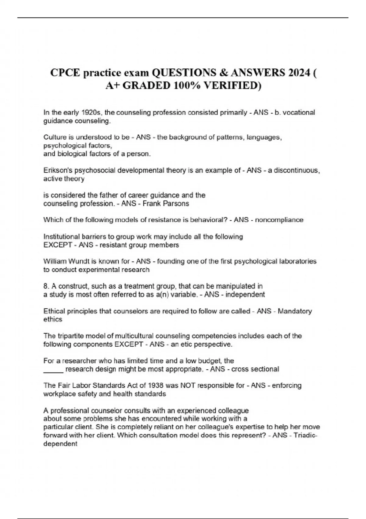CPCE practice Exam Expected Questions and Answers (Verified by Expert) CPCE practice exam QUESTIONS & ANSWERS 2024 ( A+ GRADED 100% VERIFIED) In the early 1920s, the counseling profession consisted primarily - ANS - b. vocational guidance counseling. Culture is understood to be - ANS - the background of patterns, languages, psychological factors, and biological factors of a person. Erikson's psychosocial developmental theory is an example of - ANS - a discontinuous, active theory is considered the father of career guidance and the counseling profession. - ANS - Frank Parsons Which of the following models of resistance is behavioral? - ANS - noncompliance Institutional barriers to group work may include all the following EXCEPT - ANS - resistant group members William Wundt is known for - ANS - founding one of the first psychological laboratories to conduct experimental research 8. A construct, such as a treatment group, that can be manipulated in a study is most often referred to as a(n) variable. - ANS - independent Ethical principles that counselors are required to follow are called - ANS - Mandatory ethics The tripartite model of multicultural counseling competencies includes each of the following components EXCEPT - ANS - an etic perspective. For a researcher who has limited time and a low budget, the _____ research design might be most appropriate. - ANS - cross sectional The Fair Labor Standards Act of 1938 was NOT responsible for - ANS - enforcing workplace safety and health standards A professional counselor consults with an experienced colleague about some problems she has encountered while working with a particular client. She is completely reliant on her colleague's expertise to help her move forward with her client. Which consultation model does this represent? - ANS - Triadic- dependent