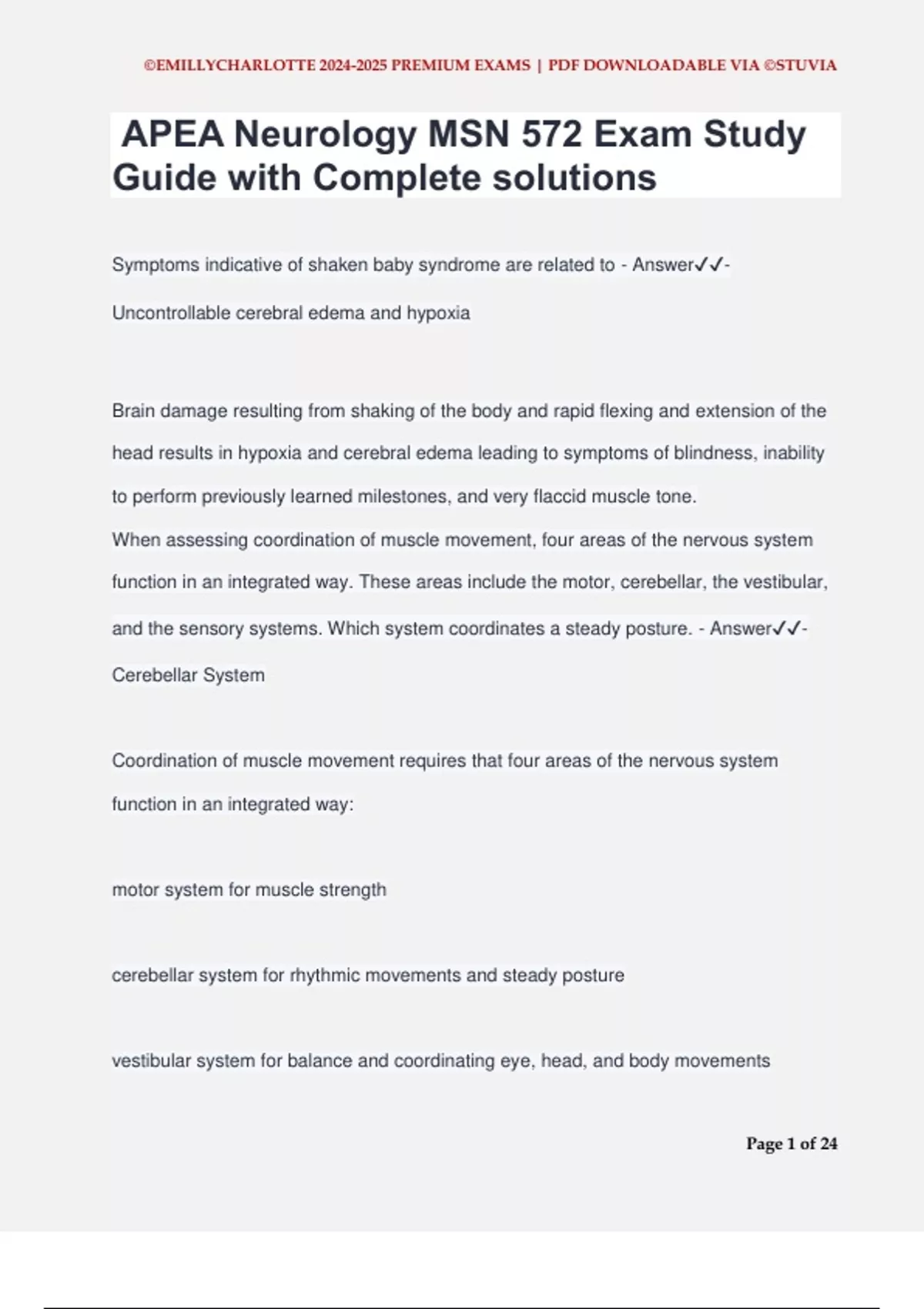 APEA Neurology MSN 572 Exam Study Guide with Complete solutions Symptoms indicative of shaken baby syndrome are related to - Answer️️ - Uncontrollable cerebral edema and hypoxia Brain damage resulting from shaking of the body and rapid flexing and extension of the head results in hypoxia and cerebral edema leading to symptoms of blindness, inability to perform previously learned milestones, and very flaccid muscle tone. When assessing coordination of muscle movement, four areas of the nervous system function in an integrated way. These areas include the motor, cerebellar, the vestibular, and the sensory systems. Which system coordinates a steady posture. - Answer️️ - Cerebellar System Coordination of muscle movement requires that four areas of the nervous system function in an integrated way: motor system for muscle strength cerebellar system for rhythmic movements and steady posture vestibular system for balance and coordinating eye, head, and body movements ©EMILLYCHARLOTTE PREMIUM EXAMS | PDF DOWNLOADABLE VIA ©STUVIA Page 2 of 24 sensory system for position sense When assessing the cranial nerves, the nurse practitioner touches the cornea lightly with a wisp of cotton. This maneuver assesses which cranial nerve - Answer️️ -Cranial nerve V Touching the cornea and assessing for a reflex assesses cranial nerve V When eliciting deep tendon reflexes in the biceps, the nurse practitioner notes an abnormal reflex in the right biceps. This abnormality is probable consistent with a pathological lesion in which segmented level of the spine? - Answer️️ -Cervical 5 and 6 The segmented levels of the deep tendon reflexes are Ankle: sacral 1 Knee: lumbar 2,3 &4 Supinator and biceps: cervical 5&6 Triceps: cervical 6&7 Uncontrolled electrical activity in the brain, which may produce minor physical signs, thought disturbances, or disturbed motor activity is: - Answer️️ -Seizure Dystonia is a neurological disorder that causes involuntary muscle spasms and twisting of the limbs. ©EMILLYCHARLOTTE PREMIUM EXAMS | PDF DOWNLOADABLE VIA ©STUVIA Page 3 of 24 Bradykinesia is the term used to describe the impaired ability to adjust to one's body position. This symptom is noted in patients who have parkinson's disease. A rhythmic oscillatory movement of a body part resulting from the contraction of opposing muscle groups is a tremor. A band of skin innervated by the sensory root of a single spinal nerve is termed a - Answer️️ -Dermatome A band of skin innervated by the sensory root of a single spinal or dorsal nerve root is termed a dermatome. A peripheral nerve field refers to an area of the skin innervated by a single nerve and is described as a cutaneous nerve distribution. A synapse is a structure that permits a neuron to pass an electrical or chemical signal to another cell. Asterixis refers to an abnormal tremor consisting of involuntary jerking movements, especially in the hands, frequently occurring with impending hepatic coma and other forms of metabolic encephalopathy. This is known as flapping tremor. A patient is asked to visually follow a finger through the cardinal fields of gaze. Which cranial nerves are being assessed? - Answer️️ -3, 4, and 6 CN 1 is the olfactory nerve and assesses smell CN 2 is the optic nerve and assesses visual acuity ©EMILLYCHARLOTTE PREMIUM EXAMS | PDF DOWNLOADABLE VIA ©STUVIA Page 4 of 24 CN 5 is the trigeminal nerve and assesses both sensory and motor functions. A patient presents with history of temp of 102, headache, and pink papules on the upper chest several hours ago. Petechiae and ecchymosis are noted on the trunk. These skin lesions may be indicative of: - Answer️️ -meningococcemia Skin lesions associated with meningococcemia initally present as pink macules and papules. Within minutes to a few hours, petechiae, hemorrhagic petechiae, hemorrhagic bullae, and purpura fulminans become apparent. With meningococcemia meningitis, the temperature may be 102 or greater and the patient appears very ill. Skin lesions associated with leukemia may include pallor, exfoliative erythroderma, nodules, petechiae, ecchymoses, pruritus, vasculitis, pyoderma gangrenosum, and bullous diseases. Skin lesions associated with neurofibromatosis may include, pallor, exfoliative erythroderma, nodules, petechiae, ecchymoses, pruritus, vaculitis, pyoderma gangrenosum, and bullous diseases. Skin lesions associated with neurofibromatosis may include, neurofibromas Cafe au lait spots, freckling in the axillary and inguinal areas, and plexiform neurofibroma. Hemorrhagic pancreatitis skin lesions include Grey Turner's sign (bruising of the flanks, appearing as a blue discoloration), Cullen's sign (superficial edema and bruising in the subcutaneous fatty tissue around the umbilicus), and panniculitis (a group of diseases whose hallmark is inflammation of subcutaneous adipose tissue) ©EMILLYCHARLOTTE PREMIUM EXAMS | PDF DOWNLOADABLE VIA ©STUVIA Page 5 of 24 A form of aphasia in which the person has difficulty speaking and understanding words and is unable to read or write is termed - Answer️️ -Global aphasia With global aphasia, the person has difficulty speaking and understanding words and is unable to read or write. In Broca's aphasia, speech is confluent, slow, with few words and laborious effort. Inflection and articulation are impaired but words are meaningful, with nouns, transitive verbs, and important adjectives. Small grammatical words are often dropped. With anomic aphasia, the person has word-finding difficulties and because of the difficulties, the person struggles to find the right words for speaking and writing. With wernicke's phasia, speech is fluent, often rapid, voluble, and effortless. Inflection and articulation are good, but sentences lack meaning and words are malformed (paraphasias) or invented (neologisms). Speech may be totally incomprehensible. At what age is it considered normal for a child to pick up objects using the palm of the 