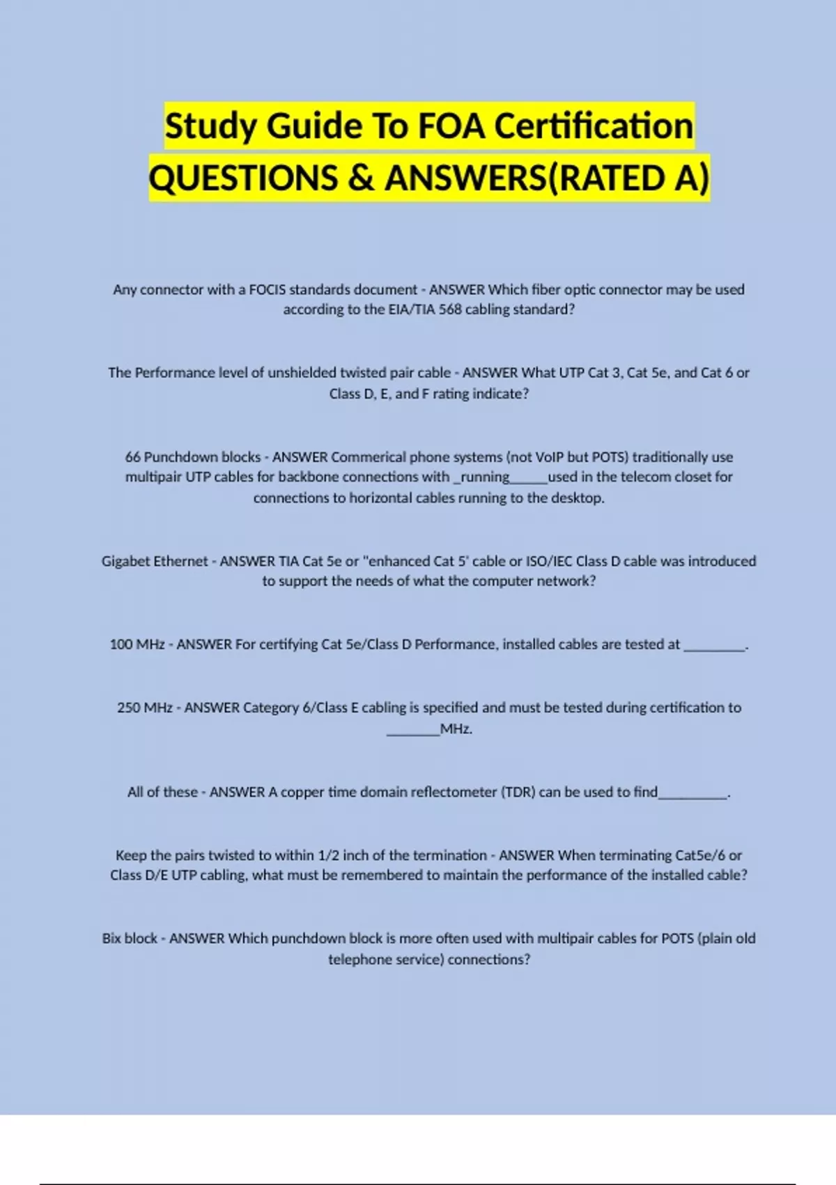 100 MHz - ANSWER For certifying Cat 5e/Class D Performance, installed cables are tested at ________.