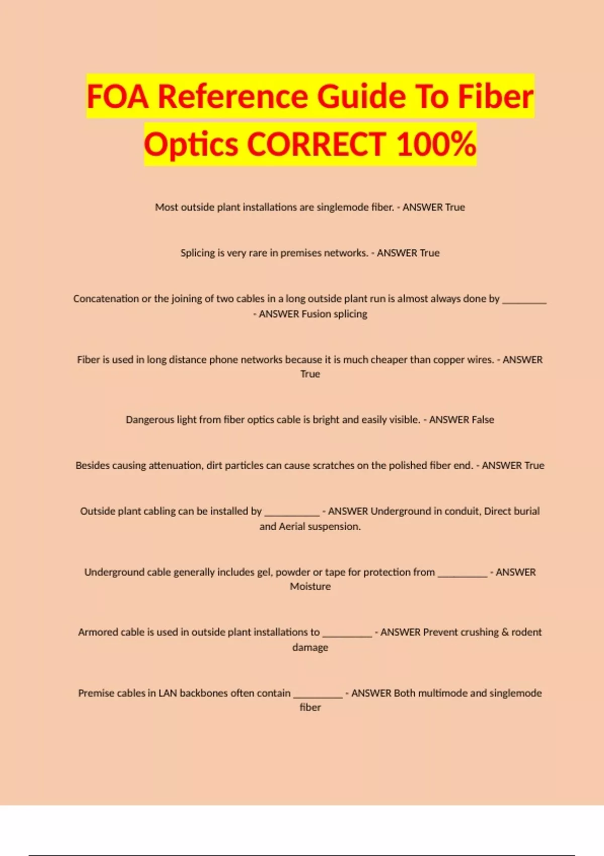 Most outside plant installations are singlemode fiber. - ANSWER True Splicing is very rare in premises networks. - ANSWER True Concatenation or the joining of two cables in a long outside plant run is almost always done by ________ - ANSWER Fusion splicing Fiber is used in long distance phone networks because it is much cheaper than copper wires. - ANSWER True Dangerous light from fiber optics cable is bright and easily visible. - ANSWER False