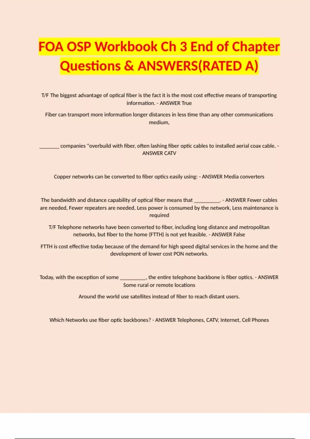 Which Networks use fiber optic backbones? - ANSWER Telephones, CATV, Internet, Cell Phones