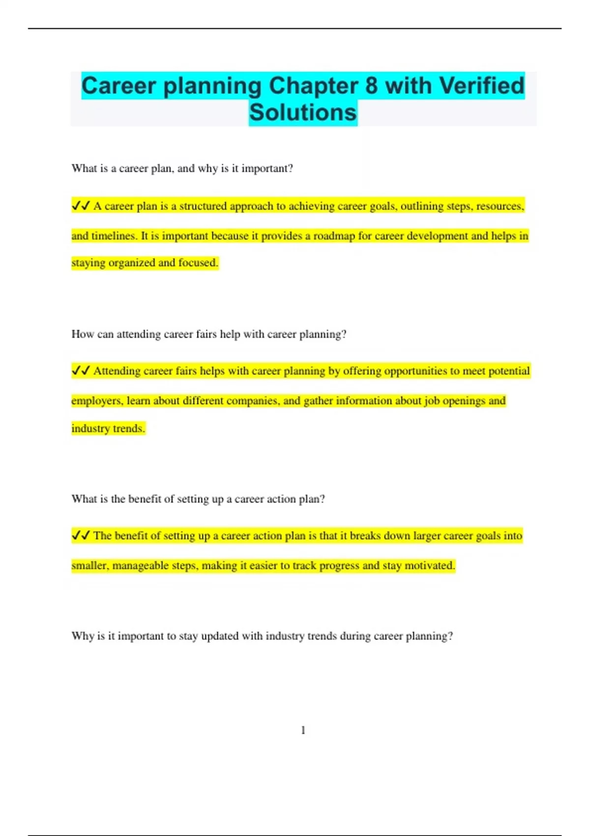 Career planning Chapter 8 with Verified Solutions What is a career plan, and why is it important? A career plan is a structured approach to achieving career goals, outlining steps, resources, and timelines. It is important because it provides a roadmap for career development and helps in staying organized and focused. How can attending career fairs help with career planning? Attending career fairs helps with career planning by offering opportunities to meet potential employers, learn about different companies, and gather information about job openings and industry trends. What is the benefit of setting up a career action plan? The benefit of setting up a career action plan is that it breaks down larger career goals into smaller, manageable steps, making it easier to track progress and stay motivated. Why is it important to stay updated with industry trends during career planning? 2 Staying updated with industry trends is important because it helps you understand current job market conditions, emerging skills, and opportunities, allowing you to adapt your career strategy accordingly. How can mentorship contribute to effective career planning? Mentorship contributes to effective career planning by providing guidance, advice, and support from experienced professionals who can help you navigate career choices and develop your skills. What are some effective ways to explore different career options? Effective ways to explore different career options include conducting informational interviews, job shadowing, researching online, and seeking advice from career counselors or mentors. How can personal values influence career choices? Personal values influence career choices by guiding you towards careers that align with your ethical beliefs, interests, and goals, ensuring greater job satisfaction and fulfillment. What should be included in a career development plan? 3 A career development plan should include your career goals, necessary skills and qualifications, a timeline for achieving these goals, and actionable steps to acquire the required experience and knowledge. How can setting realistic deadlines enhance your career planning process? Setting realistic deadlines enhances your career planning process by providing clear timeframes for achieving goals, helping you stay on track, and allowing for adjustments as needed. What strategies can help overcome obstacles in