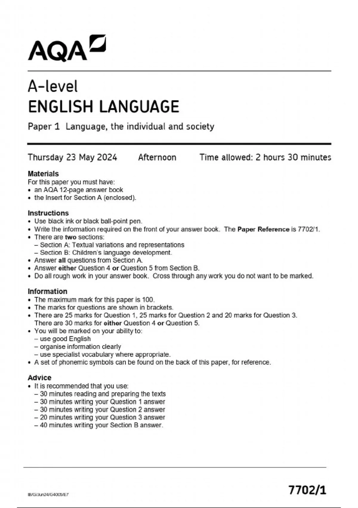 AQA A-level ENGLISH LANGUAGE Paper 1 Language, the individual and society 7702/1 QP English Language A 23May2