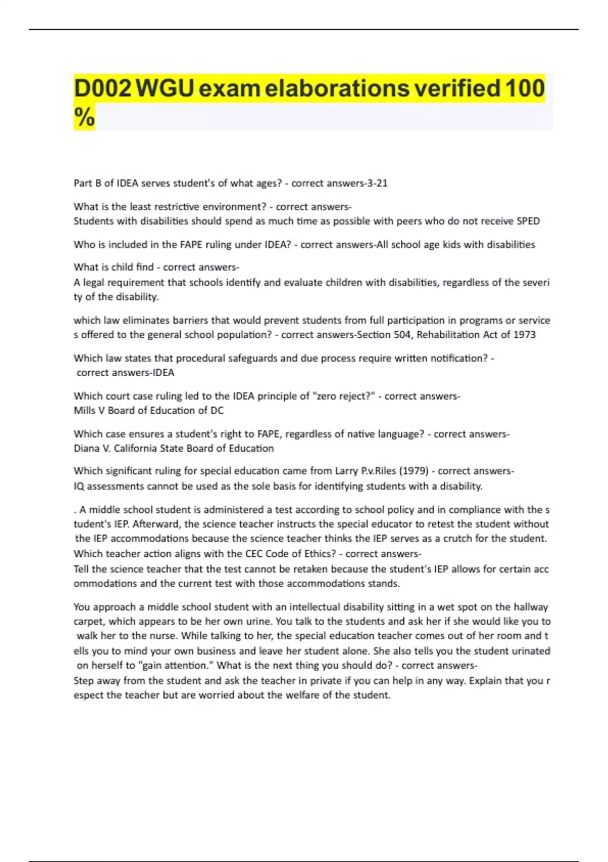 D002 WGU exam elaborations verified 100%D002 WGU exam elaborations verified 100% Part B of IDEA serves student's of what ages? - correct answers-3-21 What is the least restrictive environment? - correct answers-Students with disabilities should spend as much time as possible with peers who do not receive SPED Who is included in the FAPE ruling under IDEA? - correct answers-All school age kids with disabilities What is child find - correct answers-A legal requirement that schools identify and evaluate children with disabilities, regardless of the severity of the disability. which law eliminates barriers that would prevent students from full participation in programs or services offered to the general school population? - correct answers-Section 504, Rehabilitation Act of 1973 Which law states that procedural safeguards and due process require written notification? - correct answers-IDEA Which court case ruling led to the IDEA principle of "zero reject?" - correct answers-Mills V Board of Education of DC Which case ensures a student's right to FAPE, regardless of native language? - correct answers-Diana V. California State Board of Education Which significant ruling for special education came from Larry P.v.Riles (1979) - correct answers-IQ assessments cannot be used as the sole basis for identifying students with a disability. . A middle school student is administered a test according to school policy and in compliance with the student's IEP. Afterward, the science teacher instructs the special educator to retest the student without the IEP accommodations because the science teacher thinks the IEP serves as a crutch for the student. Which teacher action aligns with the CEC Code of Ethics? - correct answers-Tell the science teacher that the test cannot be retaken because the student's IEP allows for certain accommodations and the current test with those accommodations stands. You approach a middle school student with an intellectual disability sitting in a wet spot on the hallway carpet, which appears to be her own urine. You talk to the students and ask her if she would like you to walk her to the nurse. While talking to her, the special education teacher comes out of her room and tells you to mind your own business and leave her student alone. She also tells you the student urinated on herself to "gain attention." What is the next thing you should do? - correct answers-Step away from the student and ask the teacher in private if you can help in any way. Explain that you respect the teacher but are worried about the welfare of the student. The administrator calls a staff meeting one week before the statewide assessment period. The admin informs everyone at the meeting that students who seem to struggle with multiple choice items can be given simple clue prompts but not the obvious answer. Which action can a teacher take that supports professional ethics? - correct answers-Report the meeting and information to an admin and HR because the suggestion constitutes violation of multiple rules and laws. You have been hired as a secondary teacher and are highly qualified in math but you do not have an endorsement in special education. Your principal has shared that you will be temporarily assisting in a self-contained classroom for a few weeks due to staffing issues. The principal also shares that after a few weeks of this assignment, there will be consideration for next steps but does not specify further. What response would align with special education professional standards and practices? - correct answers-Inform the principal that this personnel structure does not represent an accurate fit of your experience and education, and that you need confirmation from other administrators for this assignment before work begins. Ms. Smith is a sixth-grade special education teacher. On a social media site, she complains about one of her students, Terrance, and calls him by name. The next day, the principal approaches Ms. Smith with a screenshot of her post sent to him anonymously. How should Ms. Smith proceed? - correct answers-Ms. Smith should apologize to Terrance's family for the offending post and remember to keep student names confidential. . Ms. Anderson is a tenth-grade special education teacher. Barry, a student on the autism spectrum, runs into her room in tears. He is upset because he left his homework at home and he will lose points in math because of it. Even though he has an IEP, there is no accommodation for late work. What is the ethical thing to do? - correct answers-Explain to Barry that as unfortunate as it is to forget your homework, there are consequences for doing so. One of the students in your class uses a certain word to get another student's attention. Other students complain that the word is a bad word and it should not be allowed. You have never heard the word before and, by all accounts, it does not sound negative. You tell the class to move on and focus on their work. One morning, the parent of the student that was insulted storms into your classroom very upset. The parent tells you the word is a highly negative and degrading term for a person with that disability. What action should be taken? - correct answers-Willingly and openly apologize to both parent and student. Develop a plan to address the incident with the class and make a commitment to educate yourself and your students further. Across the hall are two teachers whom you work with closely and are also good friends. The three of you are discussing the dread of "IEP season" and how creating new goals and performance levels is tedious work. One of the teachers suggests everyone get together at their home over the weekend to complete all the IEPs at once and support each other. What is the next step in response to this collaboration? - correct answers-Remind the teacher that IEPs should not be taken outside of the school and revising IEPs is a legal and confidential process that should not include other teachers. Anthon