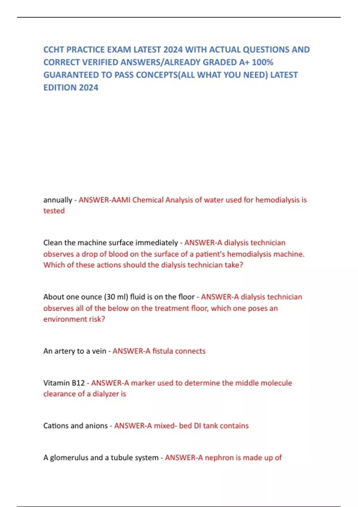 annually - ANSWER-AAMI Chemical Analysis of water used for hemodialysis is