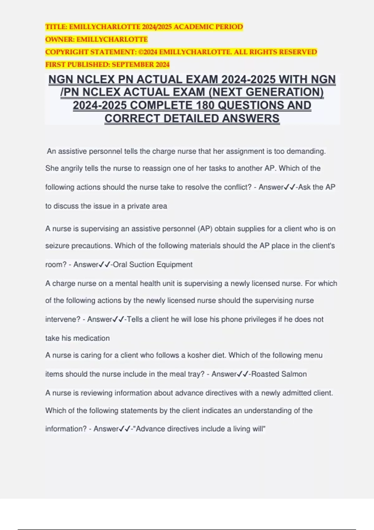 NGN NCLEX PN ACTUAL EXAM WITH NGN /PN NCLEX ACTUAL EXAM (NEXT GENERATION) COMPLETE 180 QUESTIONS AND CORRECT DETAILED ANSWERS An assistive personnel tells the charge nurse that her assignment is too demanding. She angrily tells the nurse to reassign one of her tasks to another AP. Which of the following actions should the nurse take to resolve the conflict? - Answer️️ -Ask the AP to discuss the issue in a private area A nurse is supervising an assistive personnel (AP) obtain supplies for a client who is on seizure precautions. Which of the following materials should the AP place in the client's room? - Answer️️ -Oral Suction Equipment A charge nurse on a mental health unit is supervising a newly licensed nurse. For which of the following actions by the newly licensed nurse should the supervising nurse intervene? - Answer️️ -Tells a client he will lose his phone privileges if he does not take his medication A nurse is caring for a client who follows a kosher diet. Which of the following menu items should the nurse include in the meal tray? - Answer️️ -Roasted Salmon A nurse is reviewing information about advance directives with a newly admitted client. Which of the following statements by the client indicates an understanding of the information? - Answer️️ -"Advance directives include a living will" TITLE: EMILLYCHARLOTTE 2024/2025 ACADEMIC PERIOD OWNER: EMILLYCHARLOTTE COPYRIGHT STATEMENT: ©2024 EMILLYCHARLOTTE. ALL RIGHTS RESERVED FIRST PUBLISHED: SEPTEMBER 2024 A nurse is collecting data from the caregiver of a client who has Alzheimer's disease. The caregiver reports the client has difficulty sleeping at night and wanders throughout the house. Which of the following interventions should the nurse recommend? - Answer️️ -Encourage the client to take frequent walks during the day A nurse is assisting in the care of a client who is 8hr postpartum and has uterine atony with increased bleeding. Which of the following actions should the nurse take? (Select all that apply) - Answer️️ -Assist the client to empty her bladder A nurse is reinforcing teaching with the support person of a client who is in the first stage of labor. Which of the following instructions should the nurse include regarding effleurage? - Answer️️ -"Gently stroke her abdomen during contractions" A nurse is caring for an older adult client who is postoperative following a total hip arthroplasty. The client is incontinent of stool and urine. Which of the following actions should the nurse take to prevent skin breakdown? - Answer️️ -Use a moisture barrier on the client's skin A nurse is caring for a client who has terminal cancer. Which of the following actions should the nurse take to promote the client's autonomy? - Answer️️ -Allow the client to choose treatment times A nurse in a clinic is caring for a client who is at 40 weeks of gestation and experiences a sudden gush of vaginal fluids. Which of the following findings is evidence of an obstetric complication? - Answer️️ -Appears greenish-brown in color TITLE: EMILLYCHARLOTTE 2024/2025 ACADEMIC PERIOD OWNER: EMILLYCHARLOTTE COPYRIGHT STATEMENT: ©2024 EMILLYCHARLOTTE. ALL RIGHTS RESERVED FIRST PUBLISHED: SEPTEMBER 2024 A nurse is assisting with the care of an adolescent client immediately following a lumbar puncture. Which of the following actions should the nurse take? - Answer️️ -Inform the adolescent that he might experience a headache A nurse is reinforcing teaching about advance directives with a client who has end- stage heart failure. Which of the following statements by the client indicates an understanding of the teaching? - Answer️️ -"I should discuss this document with my family after I sign it" A nurse is caring for a client who has continuous bladder irrigation following a transurethral resection of the prostate. The nurse notices clots and dark red blood in the catheter collection bag. Which of the following actions should the nurse take? - Answer️️ -Irrigate the bladder with 20 to 30 mL of 0.9% sodium chloride A nurse is planning to obtain a 12-lead ECG for a client who has a history of cardiac dysrhythmias. Which of the following actions should the nurse plan to take? - Answer️️ -Instruct the client to remain as still as possible during the recording A nurse is reinforcing teaching with a client who has genital herpes. Which of the following information should the nurse include in the teaching? - Answer️️ -"You should increase fluid intake to relieve dysuria" A nurse is preparing to empty a postoperative client's closed-wound drainage system. Which of the following actions should the nurse plan to take? - Answer️️ -Compress the container before replacing the drainage plug TITLE: EMILLYCHARLOTTE 2024/2025 ACADEMIC PERIOD OWNER: EMILLYCHARLOTTE COPYRIGHT STATEMENT: ©2024 EMILLYCHARLOTTE. ALL RIGHTS RESERVED FIRST PUBLISHED: SEPTEMBER 2024 A nurse is reinforcing teaching with the parents of a toddler who has a new diagnosis of asthma and a prescription for montelukast. Which of the following instructions should the nurse include in the teaching? - Answer️️ -Administer the medication to the toddler each evening A nurse in an acute mental health facility is caring for a newly admitted client. Which of the following should occur during the orientation phase of the nurse-client relationship? - Answer️️ -Defining responsibilities A nurse is caring for a client who reports having a decrease in fetal movement following an external cephalic version 6 hr ago. The nurse identifies the fetus is in the right occiput anterior position. The nurse should place the fetal heart monitor on which of the following sites to auscultate the fetal heart rate? - Answer️️ -Lower left A charge nurse is observing a newly licensed nurse perform suctioning for a client who has a tracheostomy. For which of the following actions by the newly licensed nurse should the charge nurse intervene? - Answer️️ -Suc