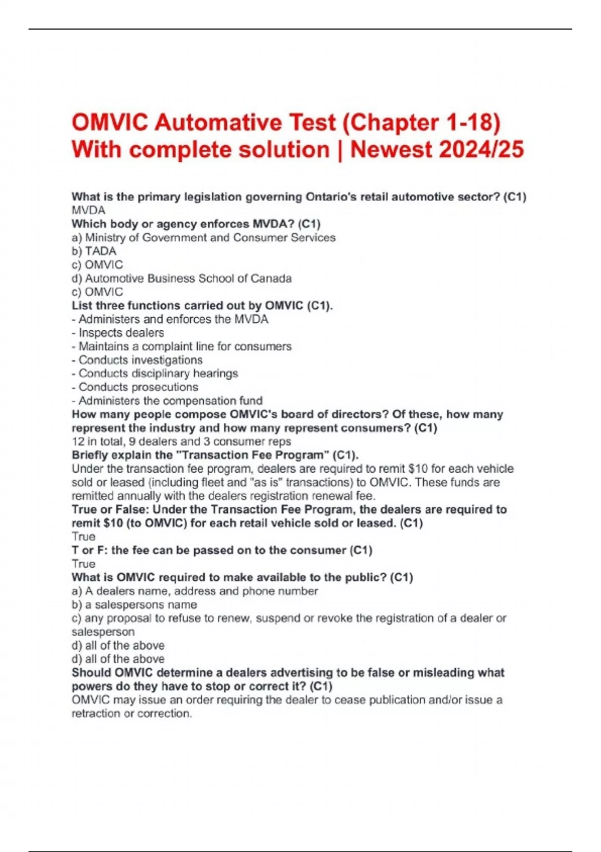OMVIC Automative Test (Chapter 1-18) With complete solution | Newest 2024/25