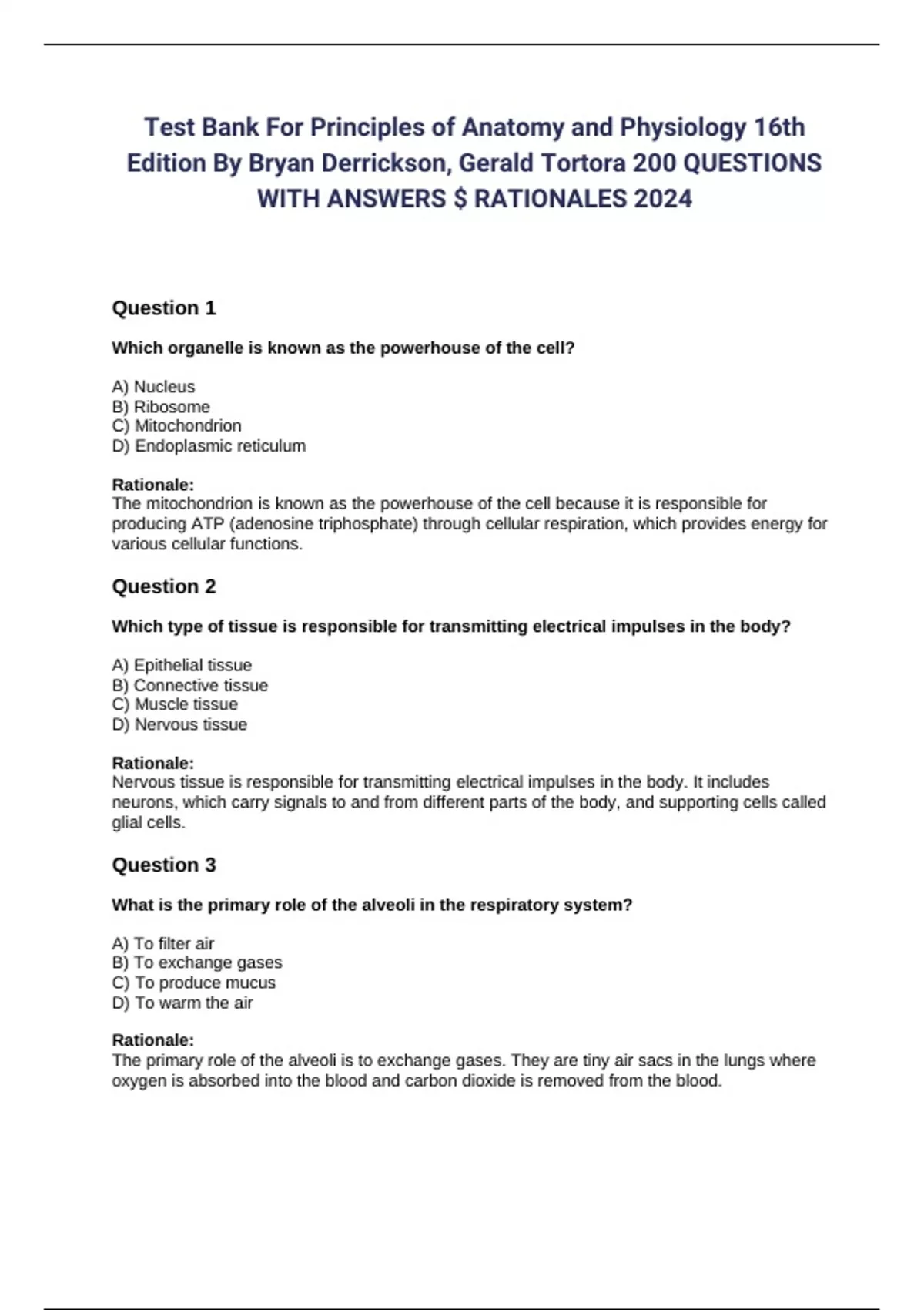 Edition By Bryan Derrickson, Gerald Tortora 200 QUESTIONS