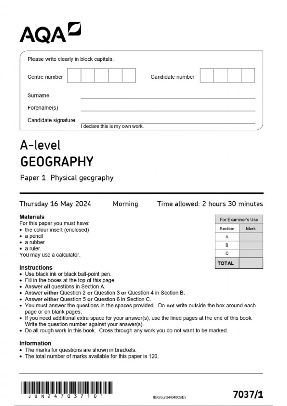 AQA A-level GEOGRAPHY Paper 1 Physical geography 7037/1 QP 2024
