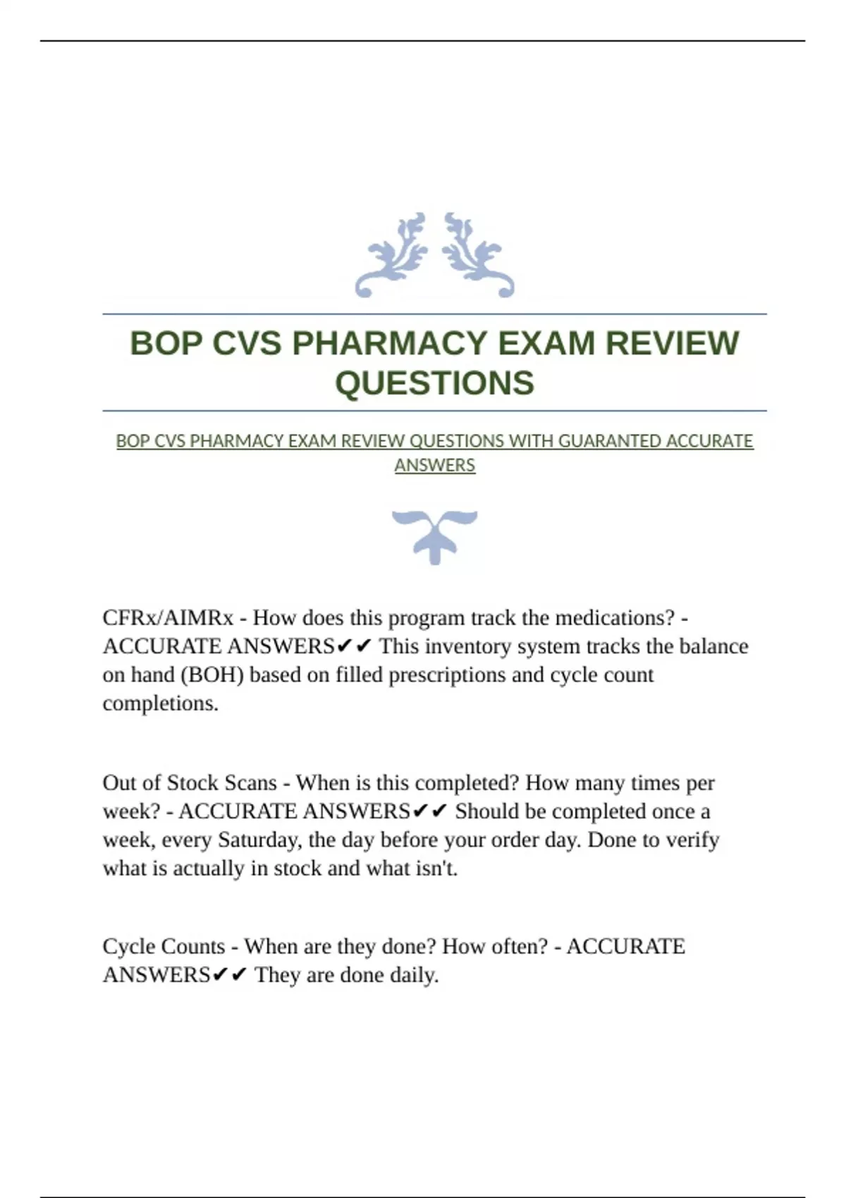 BOP CVS PHARMACY EXAM REVIEW QUESTIONS BOP CVS PHARMACY EXAM REVIEW QUESTIONS WITH GUARANTED ACCURATE ANSWERS CFRx/AIMRx - How does this program track the medications? - ACCURATE ANSWERS This inventory system tracks the balance on hand (BOH) based on filled prescriptions and cycle count completions. Out of Stock Scans - When is this completed? How many times per week? - ACCURATE ANSWERS Should be completed once a week, every Saturday, the day before your order day. Done to verify what is actually in stock and what isn't. Cycle Counts - When are they done? How often? - ACCURATE ANSWERS They are done daily. Monday - Friday by 5:55 pm at latest Saturday by 4:25 pm at latest Sunday by 3:25 pm at latest Outside Vendors - What days do we order? What days of the week do we receive orders? - ACCURATE ANSWERS Items may be ordered via Outside Vendor daily except Fridays and Saturdays. Delivers daily Monday-Friday. Define PHI - ACCURATE ANSWERS Protected Health Information. Any information deemed confidential. i.e. Medication names, patient names, DoBs, Address, RX number, Doctor information, etc... Define HIPAA - ACCURATE ANSWERS Health Insurance Portability and Accountability : Regulates to who we can and cannot release a patient's medical/ prescription information to. What is the responsibility of pick up ? - ACCURATE ANSWERS Workstation in which patients are rung up and pay for their prescription. Offer is made to counsel and patient signs to confirm receipt/acknowledges HIPAA if necessary. What is responsibility of production? - ACCURATE ANSWERS Workstation responsible for phone calls, and physically counting medications. Utilizes the quality production (QP) screen as well as the accurac