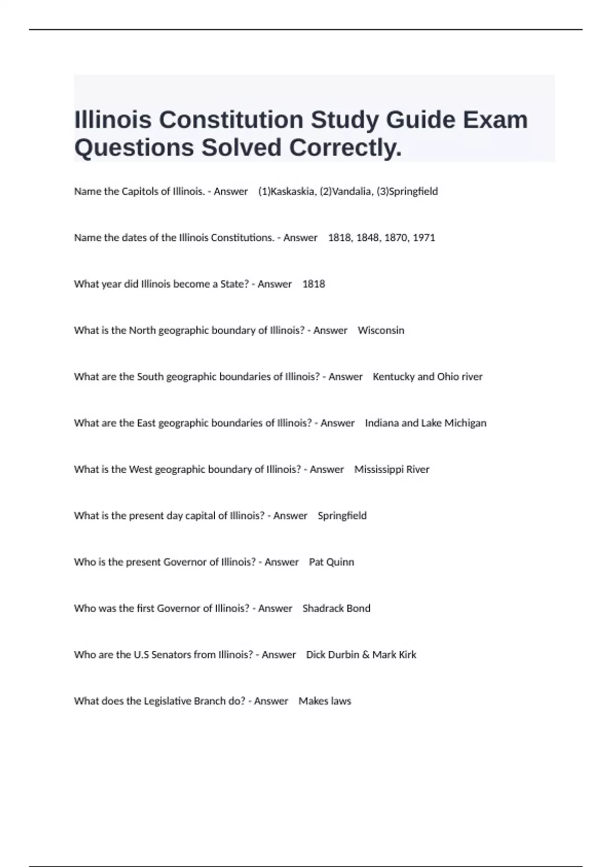 Illinois Constitution Study Guide Exam Questions Solved Correctly.