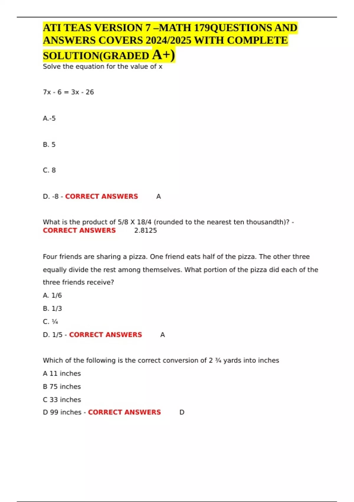 ATI TEAS VERSION 7 –MATH 179QUESTIONS AND ANSWERS COVERS 2024/2025 WITH COMPLETE SOLUTION(GRADED A+)