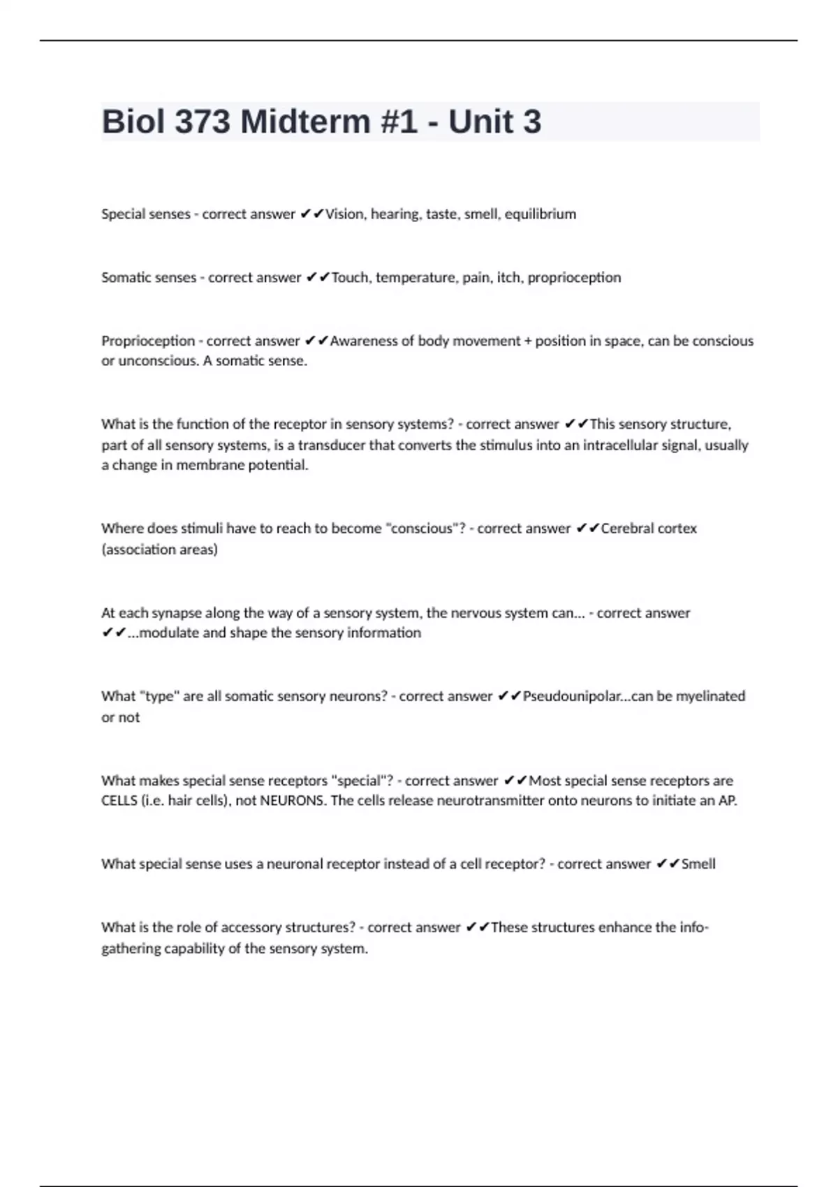 Special senses - correct answer ✔✔Vision, hearing, taste, smell, equilibrium