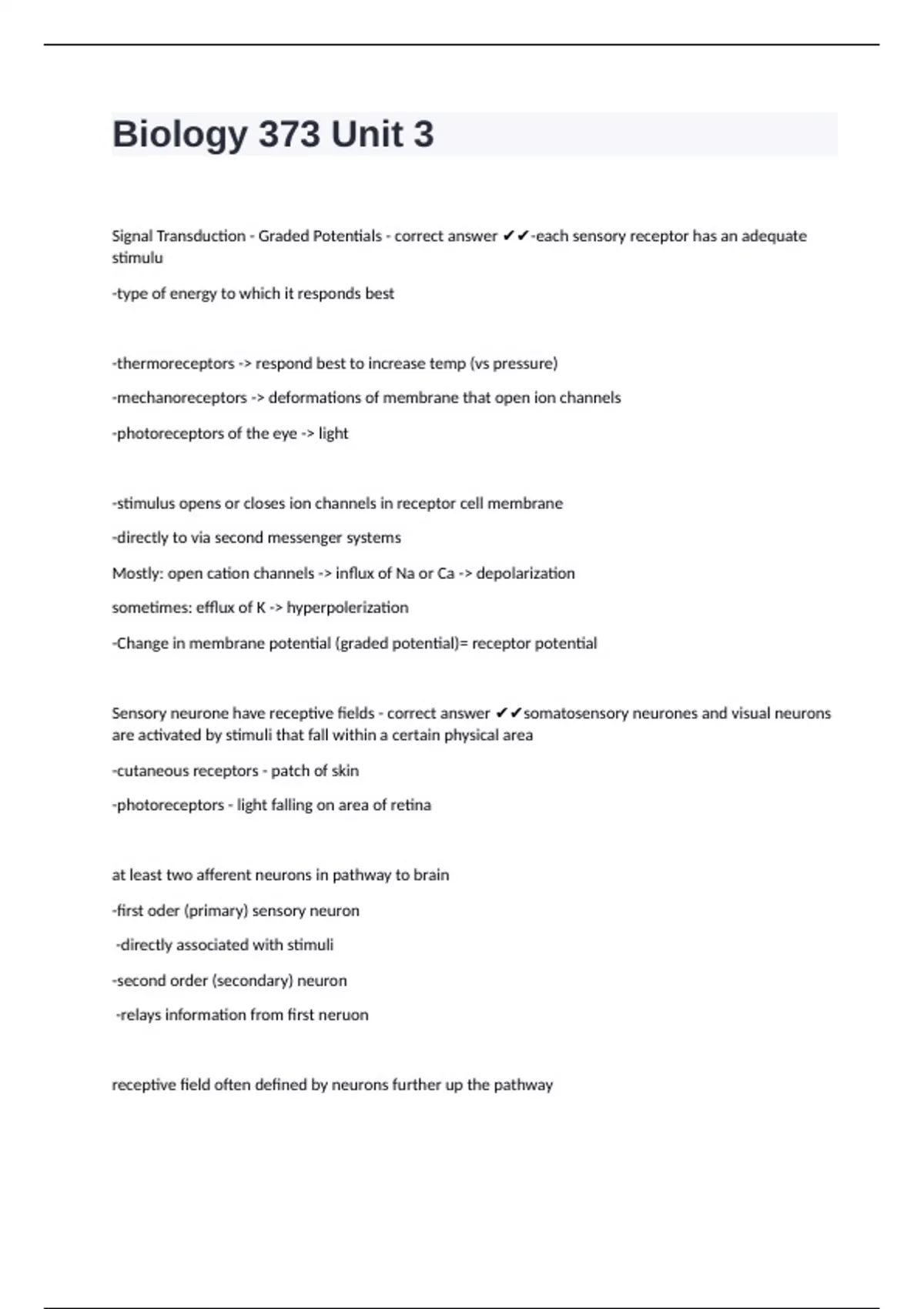 Signal Transduction - Graded Potentials - correct answer ✔✔-each sensory receptor has an adequate