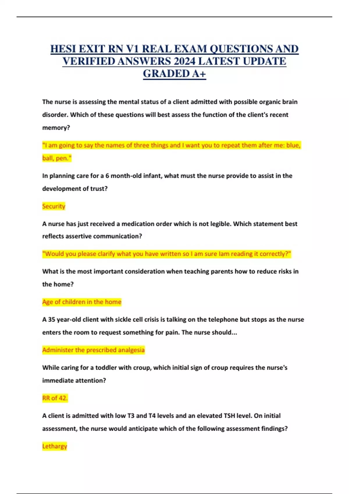 HESI EXIT RN V1 REAL EXAM QUESTIONS AND VERIFIED ANSWERS 2024 LATEST UPDATE GRADED A+