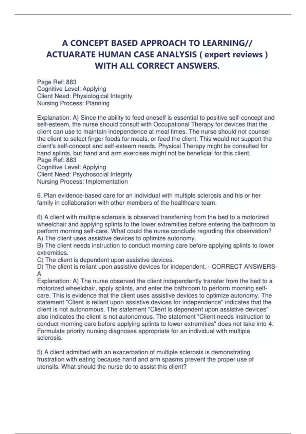 A CONCEPT BASED APPROACH TO LEARNING// ACTUARATE HUMAN CASE ANALYSIS ( expert reviews ) WITH ALL CORRECT ANSWERS. Page Ref: 883 Cognitive Level: Applying Client Need: Physiological Integrity Nursing Process: Planning Explanation: A) Since the ability to feed oneself is essential to positive self-concept and self-esteem, the nurse should consult with Occupational Therapy for devices that the client can use to maintain independence at meal times. The nurse should not counsel the client to select finger foods for meals, or feed the client. This would not support the client's self-concept and self-esteem needs. Physical Therapy might be consulted for hand splints, but hand and arm exercises might not be beneficial for this client. Page Ref: 883 Cognitive Level: Applying Client Need: Psychosocial Integrity Nursing Process: Implementation 6. Plan evidence-based care for an individual with multiple sclerosis and his or her family in collaboration with other members of the healthcare team. 6) A client with multiple sclerosis is observed transferring from the bed to a motorized wheelchair and applying splints to the lower extremities before entering the bathroom to perform morning self-care. What could the nurse conclude regarding this observation? A) The client uses assistive devices to optimize autonomy. B) The client needs instruction to conduct morning care before applying splints to lower extremities. C) The client is dependent upon assistive devices. D) The client is reliant upon assistive devices for independent. - CORRECT ANSWERSA Explanation: A) The nurse observed the client independently transfer from the bed to a motorized wheelchair, apply splints, and enter the bathroom to perform morning selfcare. This is evidence that the client uses assistive devices to optimize autonomy. The statement "Client is reliant upon assistive devices for independence" indicates that the client is not autonomous. The statement "Client is dependent upon assistive devices" also indicates the client is not autonomous. The statement "Client needs instruction to conduct morning care before applying splints to lower extremities" does not take into 4. Formulate priority nursing diagnoses appropriate for an individual with multiple sclerosis. 5) A client admitted with an exacerbation of multiple sclerosis is demonstrating frustration with eating because hand and arm spasms prevent the proper use of utensils. What should the nurse do to assist this client?