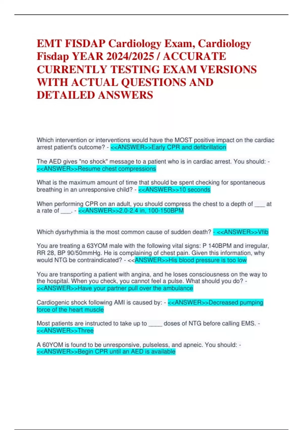 EMT FISDAP Cardiology Exam, Cardiology Fisdap YEAR 2024/2025 / ACCURATE CURRENTLY TESTING EXAM VERSIONS WITH ACTUAL QUESTIONS AND DETAILED ANSWERS
