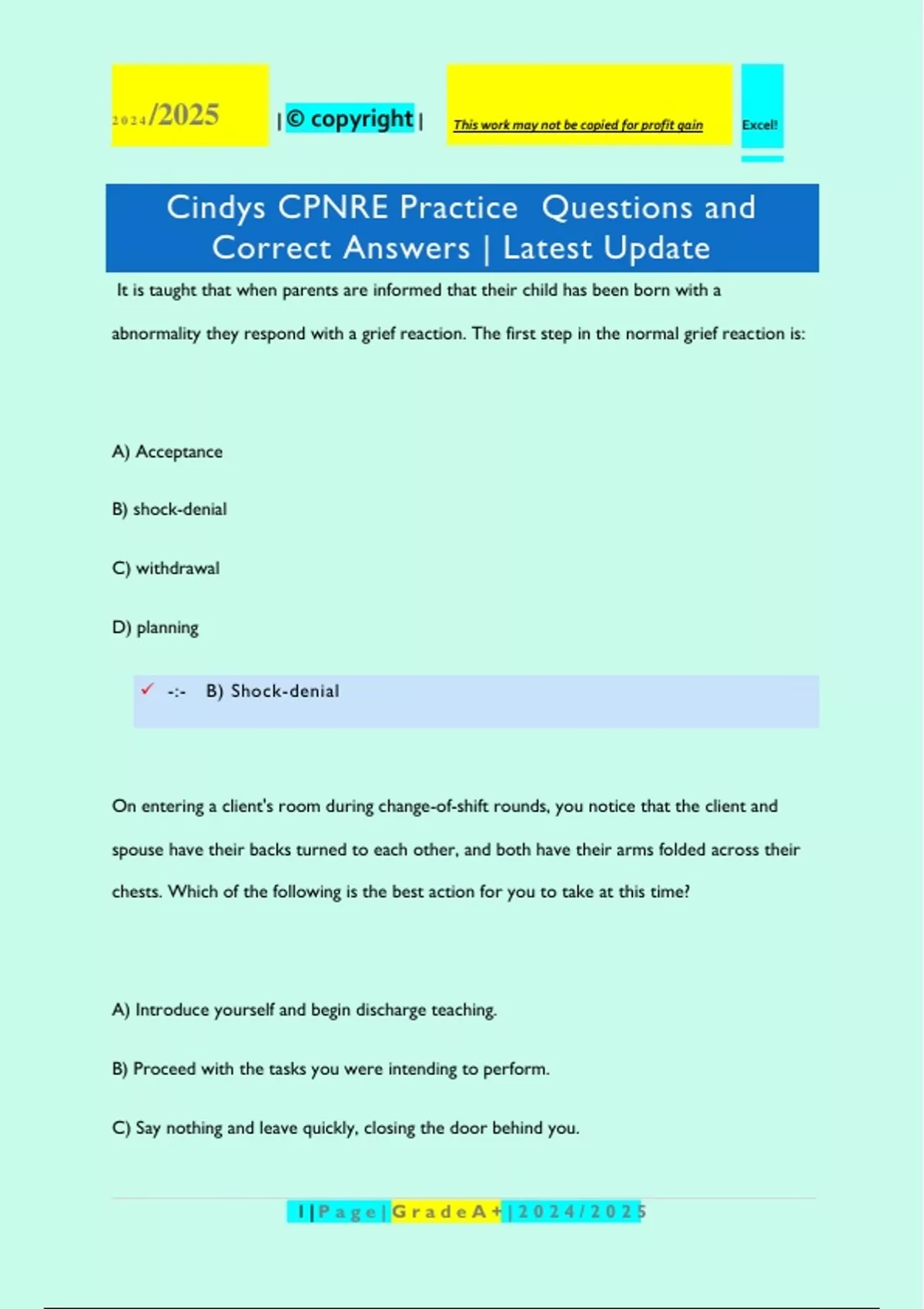 It is taught that when parents are informed that their child has been born with a abnormality they respond with a grief reaction. The first step in the normal grief reaction is: A) Acceptance B) shock-denial C) withdrawal D) planning -:- B) Shock-denial On entering a client's room during change-of-shift rounds, you notice that the client and spouse have their backs turned to each other, and both have their arms folded across their chests. Which of the following is the best action for you to take at this time? A) Introduce yourself and begin discharge teaching. B) Proceed with the tasks you were intending to perform. C) Say nothing and leave quickly, closing the door behind you. 2 | P a g e | G r a d e A + | 2 0 2 4 / 2 0 2 5 Excel! 2 0 2 4 /2025 | © copyright | This work may not be copied for profit gain D) Ask the client and spouse if they need some time alone right now. -:- D) Ask the client and spouse if they need some time alone right now. Response Feedback: The situation suggests that you entered during a stressful time. Offering privacy would be appropriate. Because the situation indicates tension between the couple, this is not the time to initiate teaching. Before performing a procedure for the first time at a new agency, what does the travel nurse do? A) Refuses to perform the procedure B) Asks the charge nurse how to perform the procedure C) Reads about the procedure in the policy and procedure manual D) Performs the procedure as at the agency where the nurse previously worked -:- C) Reads about the procedure in the policy and procedure manual Response Feedback: 3 | P a g e | G r a d e A + | 2 0 2 4 / 2 0 2 5 Excel! 2 0 2 4 /2025 | © copyright | This work may not be copied for profit gain Every agency has its own policies and way of performing procedures. The charge nurse may not know how the procedure should be performed or may explain it incorrectly. The procedure may be performed differently than in the previous agency. If the nurse refuses to perform procedures that are covered by the nursing practice act, the nurse could be fired. The surgical unit has initiated the use of a pain rating scale to assess the severity of clients' pain during their postoperative recovery. The nurse assigned to a client can look at the pain flow sheet to see the client's pain scores over the last 24 hours. Use of the pain scale is an example of adherence to which intellectual standard? A) Depth B) Specificity C) Relevance D) Consistency -:- D) Consistency Response Feedback: Using the same pain scale for all clients and ratings promotes consistency—each nurse has the same measurement scale to compare assessments. Relevance refers to how applicable the assessment is. An assessment has depth when it deals with less obvious issues. Specificity 4 | P a g e | G r a d e A + | 2 0 2 4 / 2 0 2 5 Excel! 2 0 2 4 /2025 | © copyright | This work may not be copied for profit gain refers to the ability of the assessment to provide information about the particular problem of interest. Which of the following is the most accurate information to give a nurse during change-ofshift reporting? A) Client refuses to take medications. B) Client reports sharp pain in left anterior knee. C) Client encouraged to consume more fluids D) Client expressed concern about pending surgery. -:- B) Client reports sharp pain in left anterior knee. Response Feedback: The information in option B represents objective data that the nurse can use as part of baseline information. "Encouraged" and "more" are vague terms. "Concern" is also vague; relating the exact concern would be more accurate. Option A may be true, but accurate data would also report why the client refused medication. 5 | P a g e | G r a d e A + | 2 0 2 4 / 2 0 2 5 Excel! 2 0 2 4 /2025 | © copyright | This work may not be copied for profit gain The nurse refers to a client's postsurgical written plan of care, noting that the client has a drainage device collecting wound drainage. The surgeon is to be notified when drainage in the device exceeds 100 mL for the day. The nurse carefully notes the amount of drainage currently in the device. This is an example of which of the following? A) Planning B) Evaluation C) Assessmen