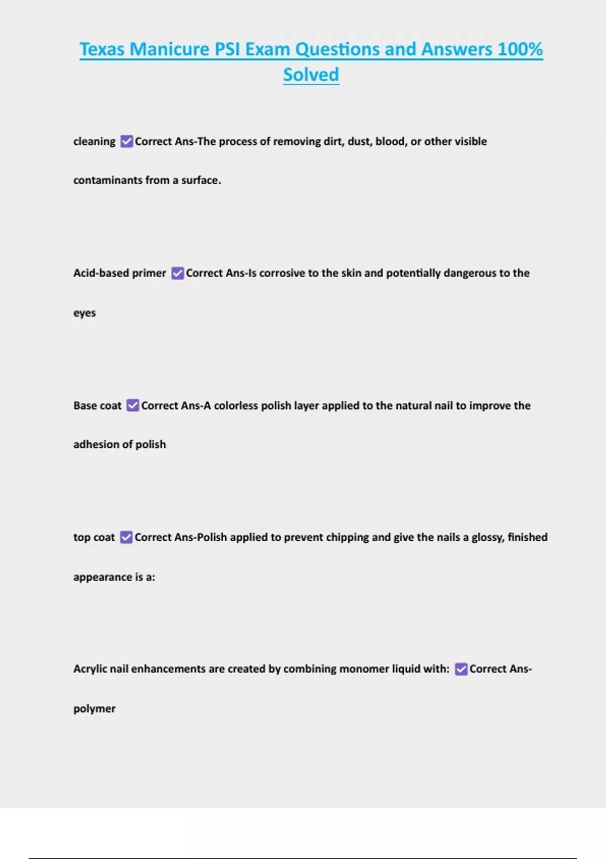, Texas Manicure PSI Exam Questions and Answers 100%