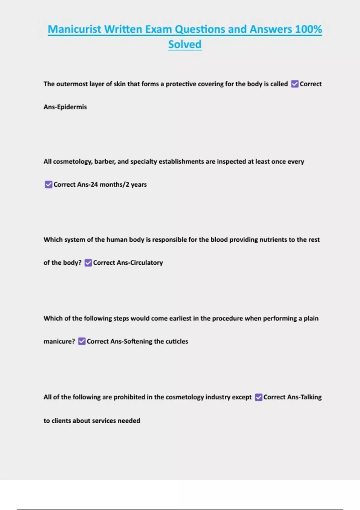 Manicurist Written Exam Questions and Answers 100% Solved