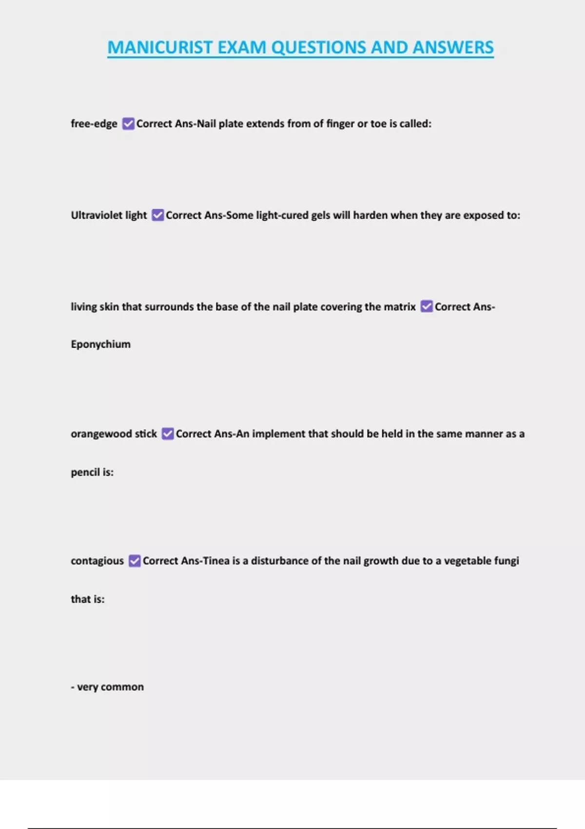 , MANICURIST EXAM QUESTIONS AND ANSWERS