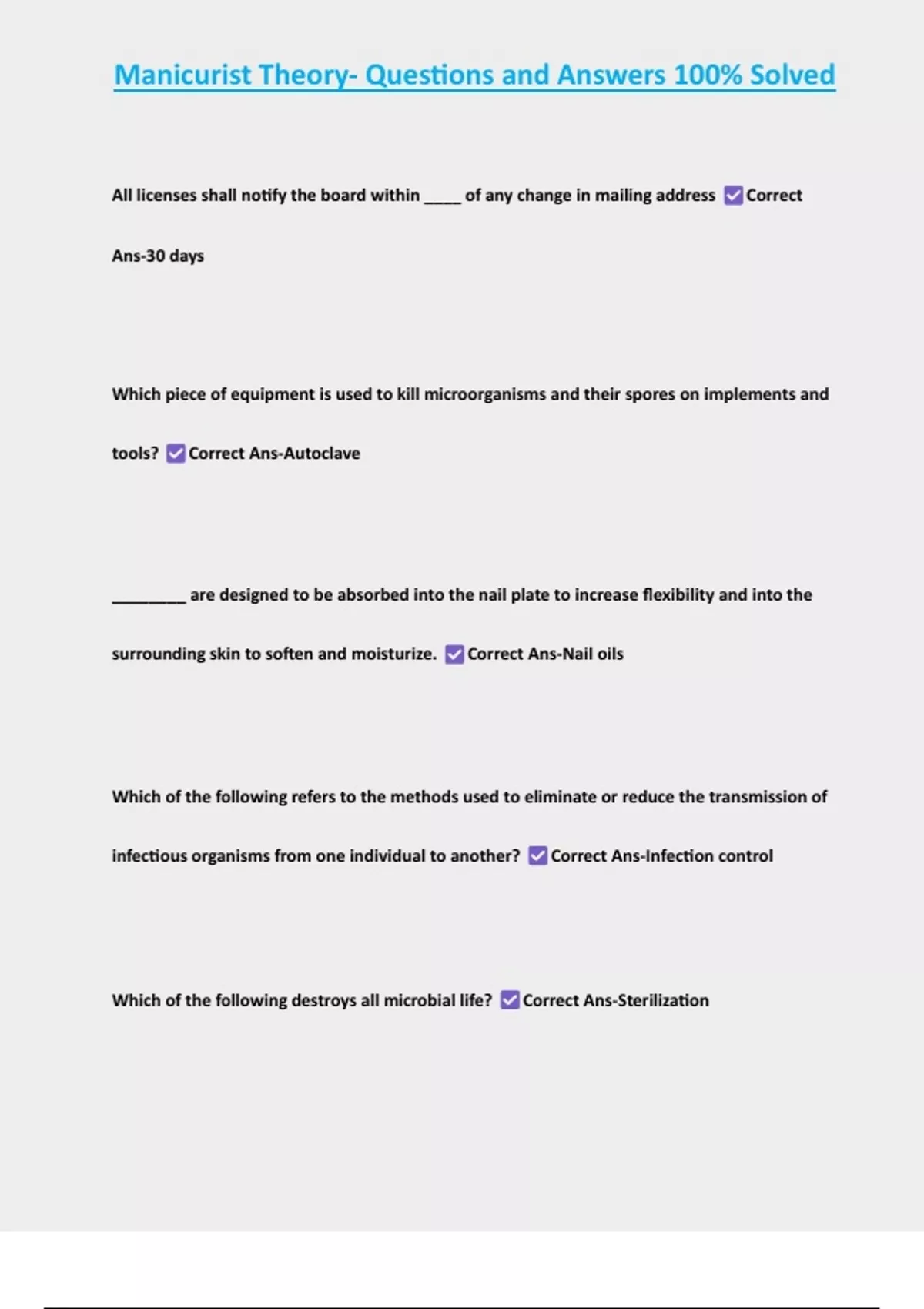 , Manicurist Theory- Questions and Answers 100% Solved