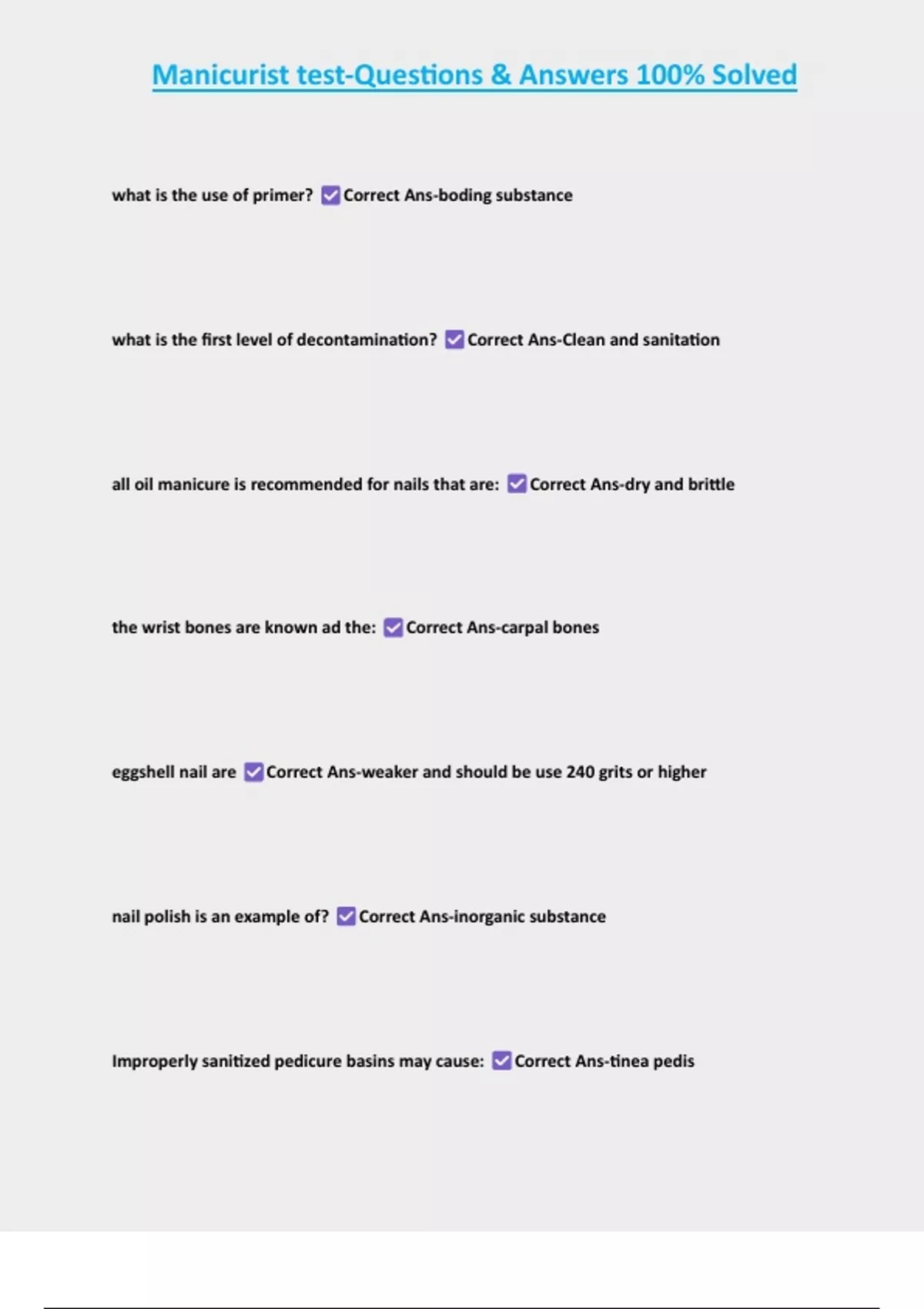 Manicurist test-Questions & Answers 100% Solved