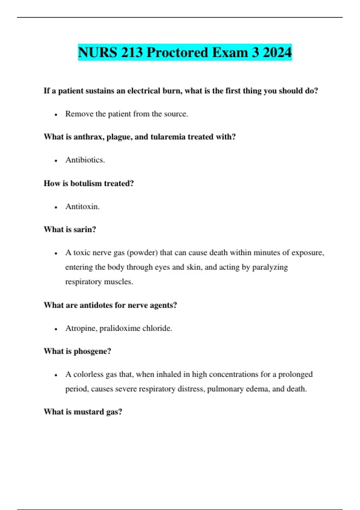 NURS 213 Proctored Exam 3 2024 NURS 213 Proctored Exam 3 2024 NURS 213 Proctored Exam 3 2024 NURS 213 Proctored Exam 3 2024 NURS 213 Proctored Exam 3 2024 If a patient sustains an electrical burn, what is the first thing you should do? • Remove the patient from the source. What is anthrax, plague, and tularemia treated with? • Antibiotics. How is botulism treated? • Antitoxin. What is sarin? • A toxic nerve gas (powder) that can cause death within minutes of exposure, entering the body through eyes and skin, and acting by paralyzing respiratory muscles. What are antidotes for nerve agents? • Atropine, pralidoxime chloride. What is phosgene? • A colorless gas that, when inhaled in high concentrations for a prolonged period, causes severe respiratory distress, pulmonary edema, and death. What is mustard gas? • A yellow to brown gas with a garlic-like odor, irritating the eyes and causing skin burns or blisters. What are radiological dispersal devices? • Also known as "dirty bombs," these are explosives combined with radioactive material. What is the RED tag criteria? • Critically injured patients with problems requiring immediate intervention (EMERGENT). Respiratory rate >30 or <30 with capillary refill >2 seconds; assess mental status if capillary refill is <2 seconds. Patients who cannot follow simple commands also fall under this category. What is the criteria for a yellow tag? • Urgent; injured patients who will require medical attention but will not die if care is delayed. They are not ambulatory and need a stretcher for transport but can follow simple commands. What is the criteria for a green tag? • Ambulatory, not critically injured, and able to walk to a safe place. What is the criteria for a black tag? • Expectant or dead; patients who are deceased or not expected to live. If a patient is not breathing, manually open the airway. If the patient remains apneic, they are tagged black. What should you tag a patient if they are apneic on arrival but begin to breathe after manually opening their airway? • RED. Rule of Nines: What is the percentage for the torso and back? • 18% each. Rule of Nines: What is the percentage for the arms and head? • 4.5% each. Rule of Nines: What is the percentage for the legs? • 9% each. If a patient sustains a chemical burn, what is the first thing you should do? • Brush solid particles off the skin and use water lavage. If a patient sustains a small thermal burn, what is the first thing you should do? • Cover with a clean, cool, tap water-dampened towel. If a patient sustains a large thermal burn, what is the first thing you should do? • Assess abcs. Do not immerse in cool water or pack with ice. Remove burned clothing and wrap the patient in a clean, dry sheet or blanket. If a patient sustains an inhalation injury, what is the first thing you should do? • Observe for signs of respiratory distress or compromise. Burn complications include: • Hypovolemia, infection, compartment syndrome, edema, altered mental status, adynamic ileus, blisters, dysrhythmias, tissue ischemia, necrosis, sludging, airway obstruction, renal ischemia, and acute tubular necrosis. What is the Parkland Baxter formula? • 4 ml × TBSA% × weight in kg. Acute Respiratory Distress Syndrome (ARDS) etiology: • Develops from various direct or indirect lung injuries, causing low blood oxygen levels. Fluids build up inside the tiny air sacs of the lungs, and surfactant breaks down. The most common cause is sepsis. The first symptom is typically shortness of breath; the main treatment is supplemental oxygen.