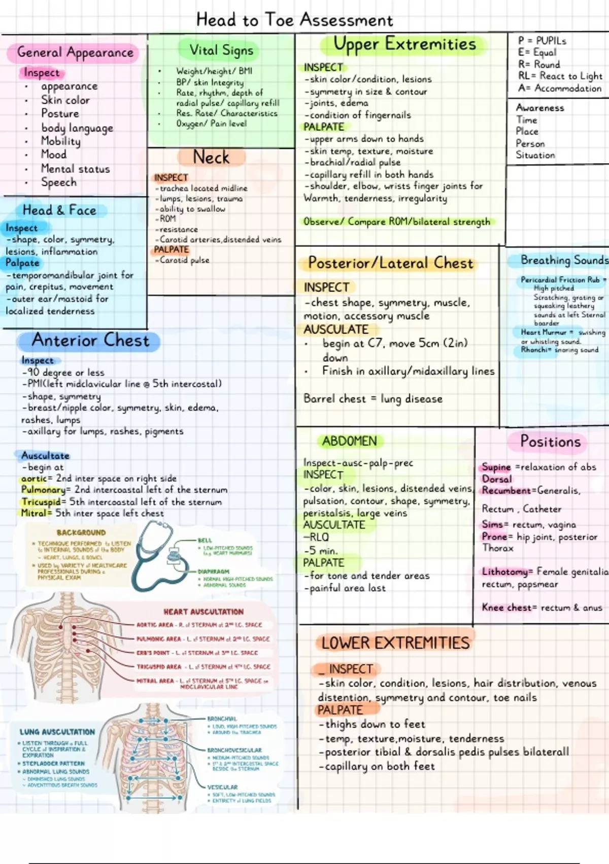 Pulmonary= 2nd intercoastal left of the sternum -color, skin, lesions, distended veins, Recumbent=Generalis,