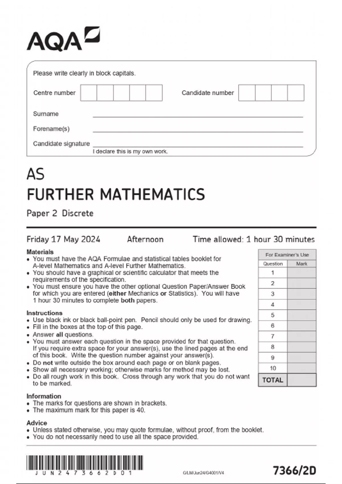 AQA AS FURTHER MATHEMATICS Paper 2 Discrete Friday 17 May 2024