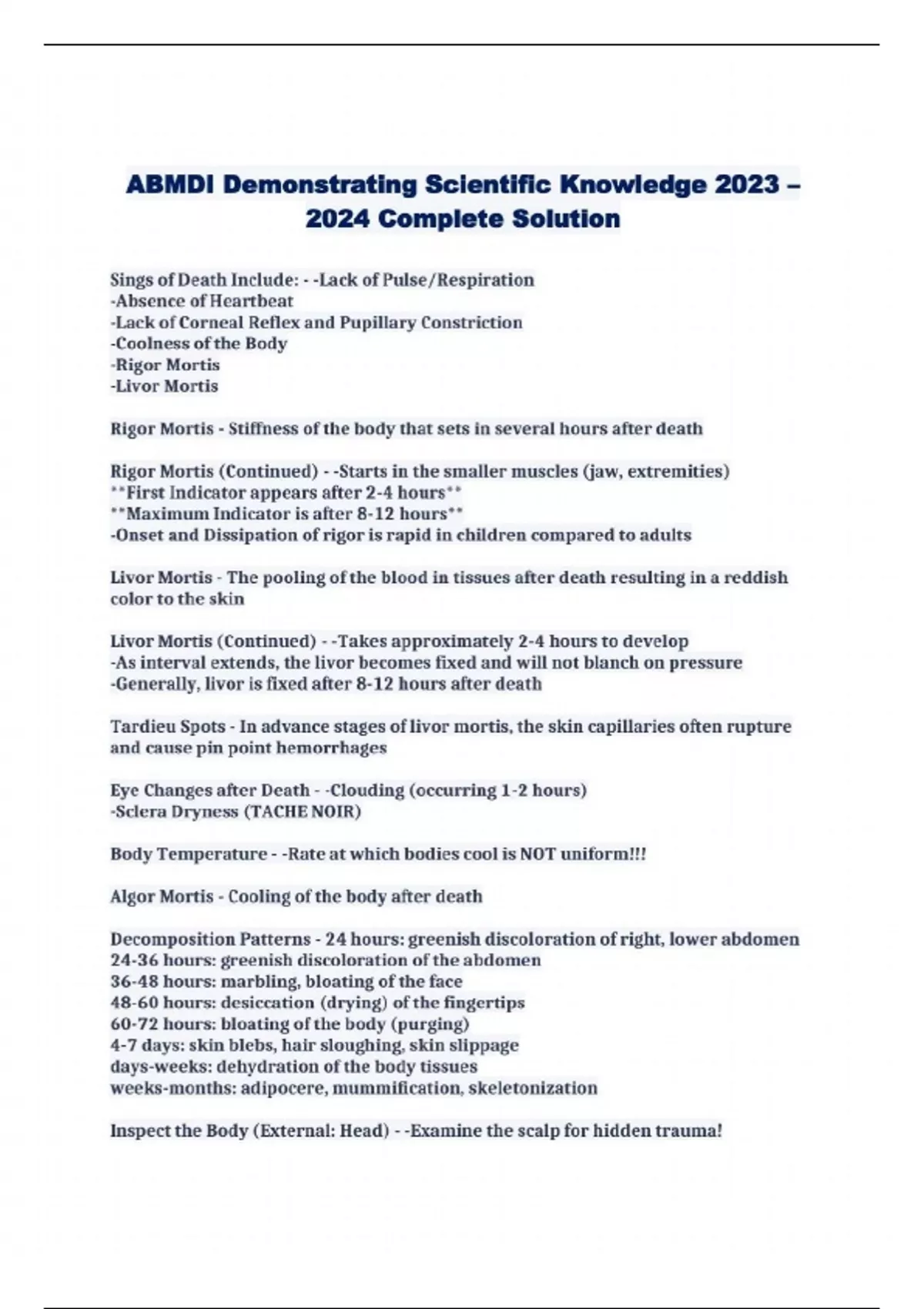 Sings of Death Include: - -Lack of Pulse/Respiration -Absence of Heartbeat -Lack of Corneal Reflex and Pupillary Constriction -Coolness of the Body -Rigor Mortis -Livor Mortis Rigor Mortis - Stiffness of the body that sets in several hours after death Rigor Mortis (Continued) - -Starts in the smaller muscles (jaw, extremities) * *First Indicator appears after 2-4 hours* * * *Maximum Indicator is after 8-12 hours* + -Onset and Dissipation of rigor is rapid in children compared to adults Livor Mortis - The pooling of the blood in tissues after death resulting in a reddish color to the skin Livor Mortis (Continued) - -Takes approximately 2-4 hours to develop -As interval extends, the livor becomes fixed and will not blanch on pressure -Generally, livor is fixed after 8-12 hours after death Tardieu Spots - In advance stages oflivor mortis, the skin capillaries often rupture and cause pin point hemorrhages Eye Changes after Death - -Clouding (occurring 1-2 hours) -Sclera Dryness (TACHE NOIR) Body Temperature - -Rate at which bodies cool is NOT uniform!!! Algor Mortis - Cooling of the body after death Decomposition Patterns - 24 hours: greenish discoloration of right, lower abdomen 24-36 hours: greenish discoloration of the abdomen 36-48 hours: marbling, bloating of the face 48-60 hours: desiccation (drying) of the fingertips 60-72 hours: bloating ofthe body (purging) 4-7 days: skin blebs, hair sloughing, skin slippage days-weeks: dehydration of the body tissues weeks-months: adipocere, mummification, skeletonization Inspect the Body (External: Head) - -Examine the scalp for hidden trauma! -Lacerations may stick together; bullet wounds may be obscured -Inspect ears for hemorrhage (foreign bodies -Evaluate eyes for petechial hemorrhages, jaundice, or trauma -Oral cavity may reveal trauma, forei